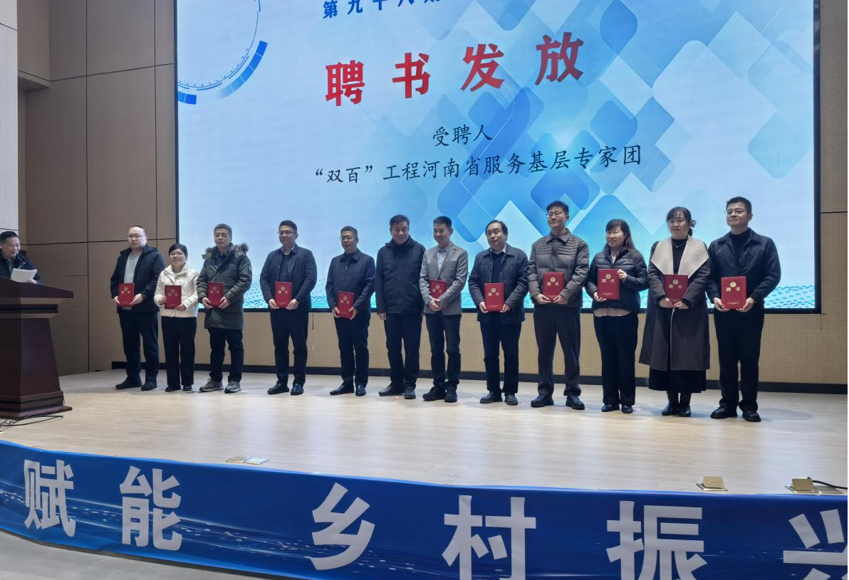 確山縣政府、河南牧業經濟學院、河南康誠農業科技有限公司、確山縣農投城鄉發展有限公司現場簽約,共同開啟政、校、企協同發展新篇章。駐馬店市人力資源和社會保障局向“雙百”工程河南省服務基層專家團授旗,確山縣政府為專家團成員頒發聘書,標志著科技服務長效機制正式建立。
