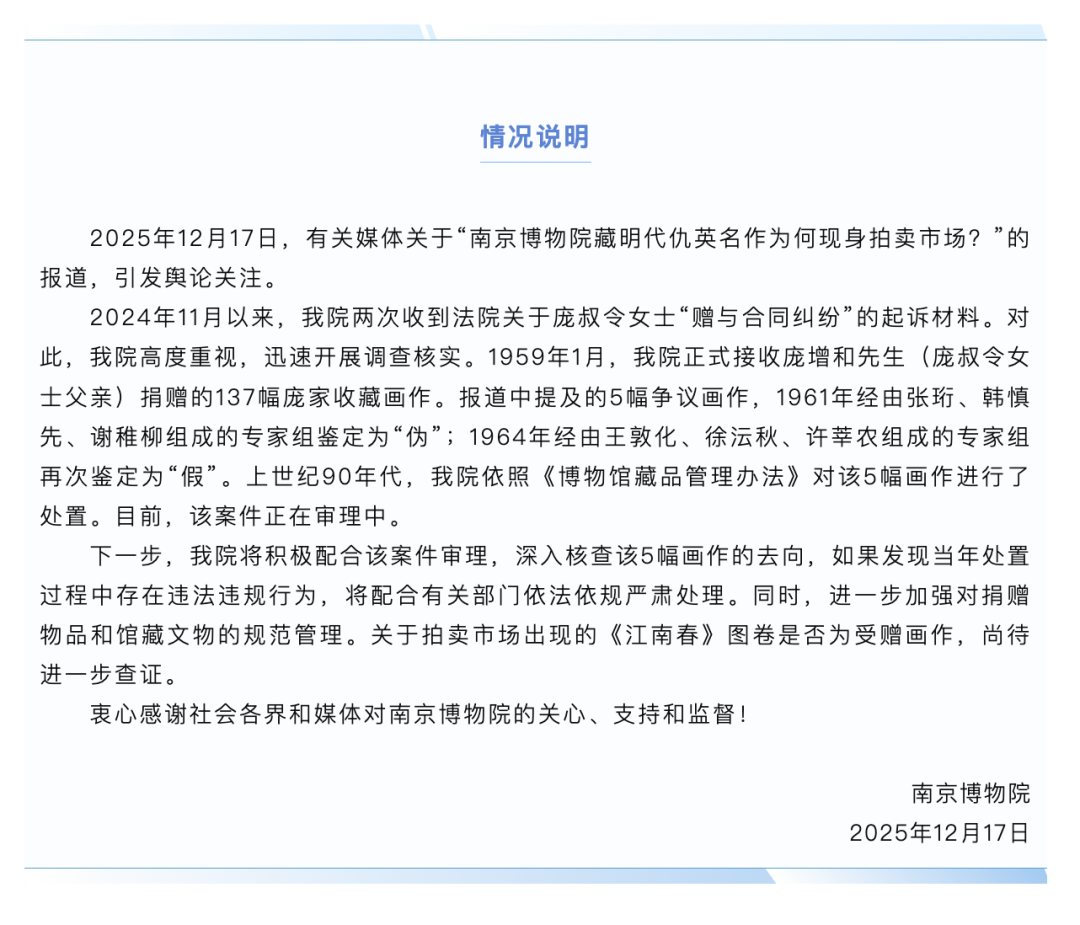 2025年12月17日,有關(guān)媒體關(guān)于“南京博物院藏明代仇英名作為何現(xiàn)身拍賣(mài)市場(chǎng)?”的報(bào)道,引發(fā)輿論關(guān)注。