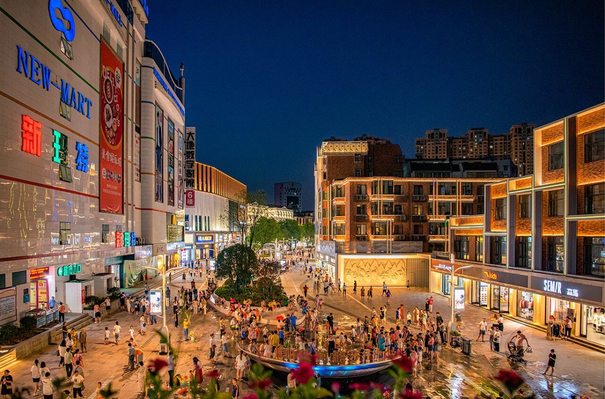 在距此不遠的勝利路步行街,同樣煥發著蓬勃生機。這條歷史底蘊深厚的商業街區,采用“新豫風 + 現代時尚”風格,以信陽毛尖“一芽兩葉”為設計核心,完成交通提升、建筑立面改造、景觀打造、夜景亮化、店招優化、智慧服務、市政設施完善、文化特色塑造、業態升級九大工程,形成“五大綜合體 + 商超 + 沿街商鋪”的支撐體系,構建“主力商業 + 特色業態 + 融合業態”格局,實現了規劃科學、空間開闊、功能完備的華麗轉身。