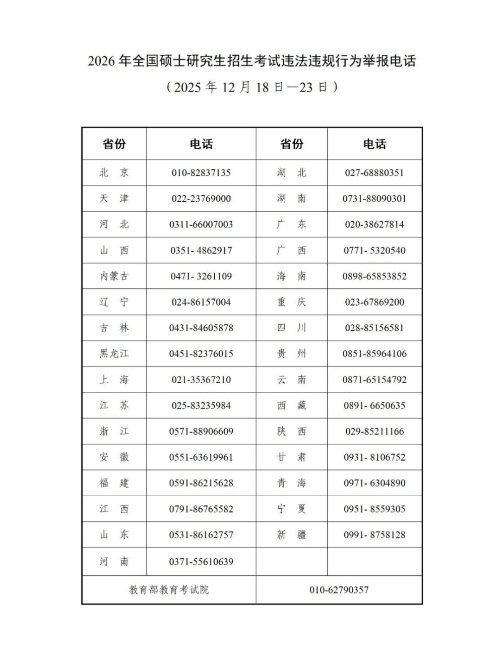 現(xiàn)向社會公布2026年全國碩士研究生招生考試違法違規(guī)行為舉報電話,歡迎廣大考生和公眾參與監(jiān)督。