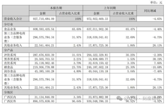 從業(yè)務結構來看,黑芝麻存在明顯的“頭重腳輕”問題。核心的沖飲食品業(yè)務雖保持47.12%的較高毛利率,但增長動能嚴重不足。2025年中報顯示,沖飲食品實現(xiàn)收入2.88億元,占總收入的31.01%,但結合前三季度整體營收下滑趨勢,這一現(xiàn)象背后,是消費場景的變遷與產品創(chuàng)新的缺位。