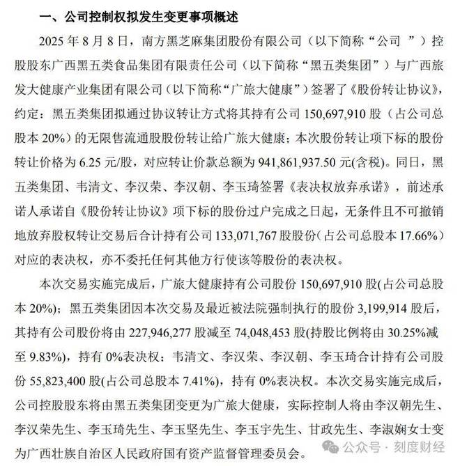 《刻度財經(jīng)》發(fā)現(xiàn),黑芝麻于12月10日官宣控制權擬變更,控股股東黑五類集團擬以9.42億元對價,將20%股份轉讓給廣西國資背景的廣旅大健康,實控人將變?yōu)閺V西國資委。