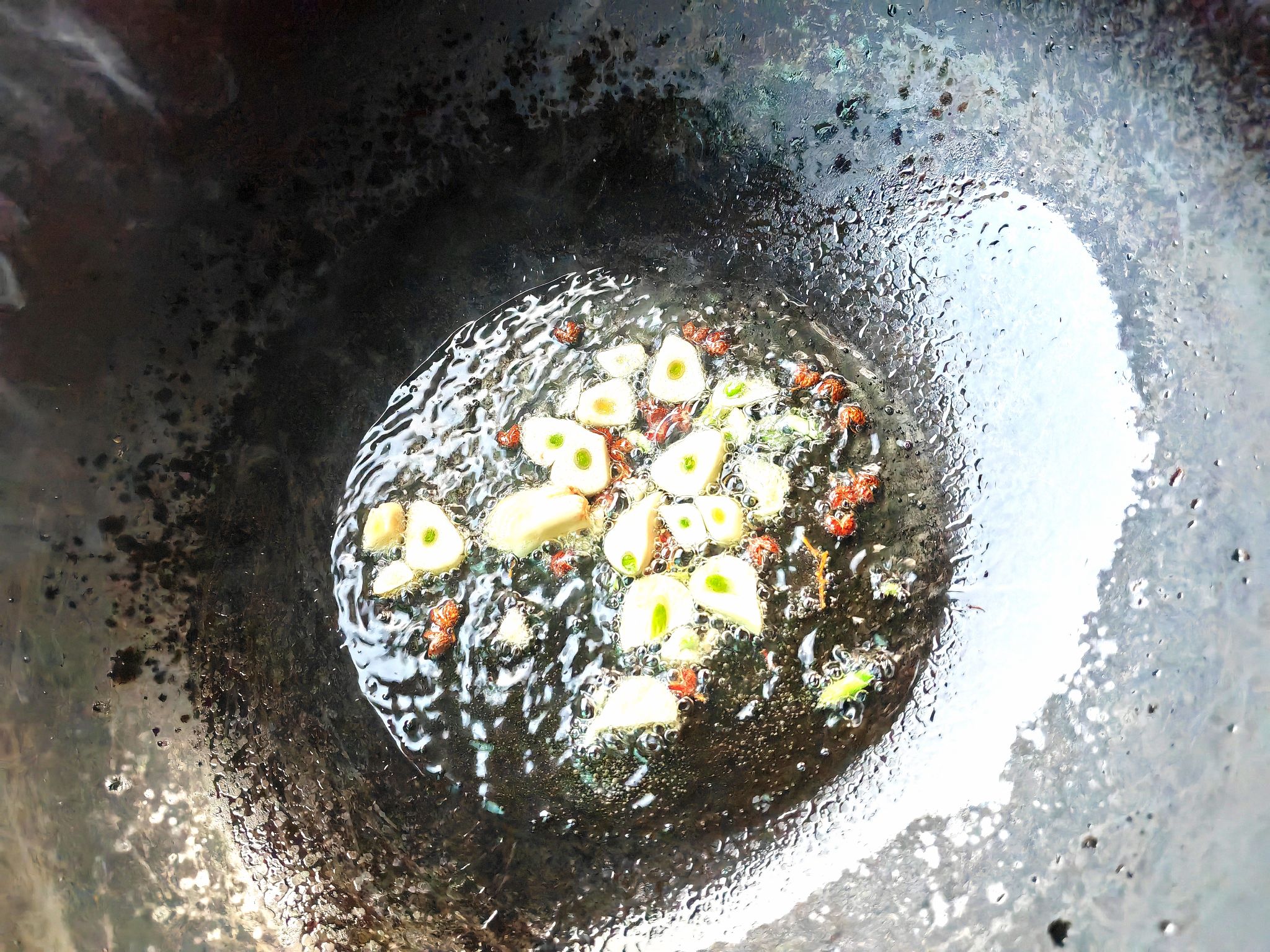 我今天沒搗蒜泥,切了點蒜片,抓了點花椒,熱鍋冷油爆香,然后把芹菜葉倒鍋里翻炒一番,加鹽調味,即可出鍋。