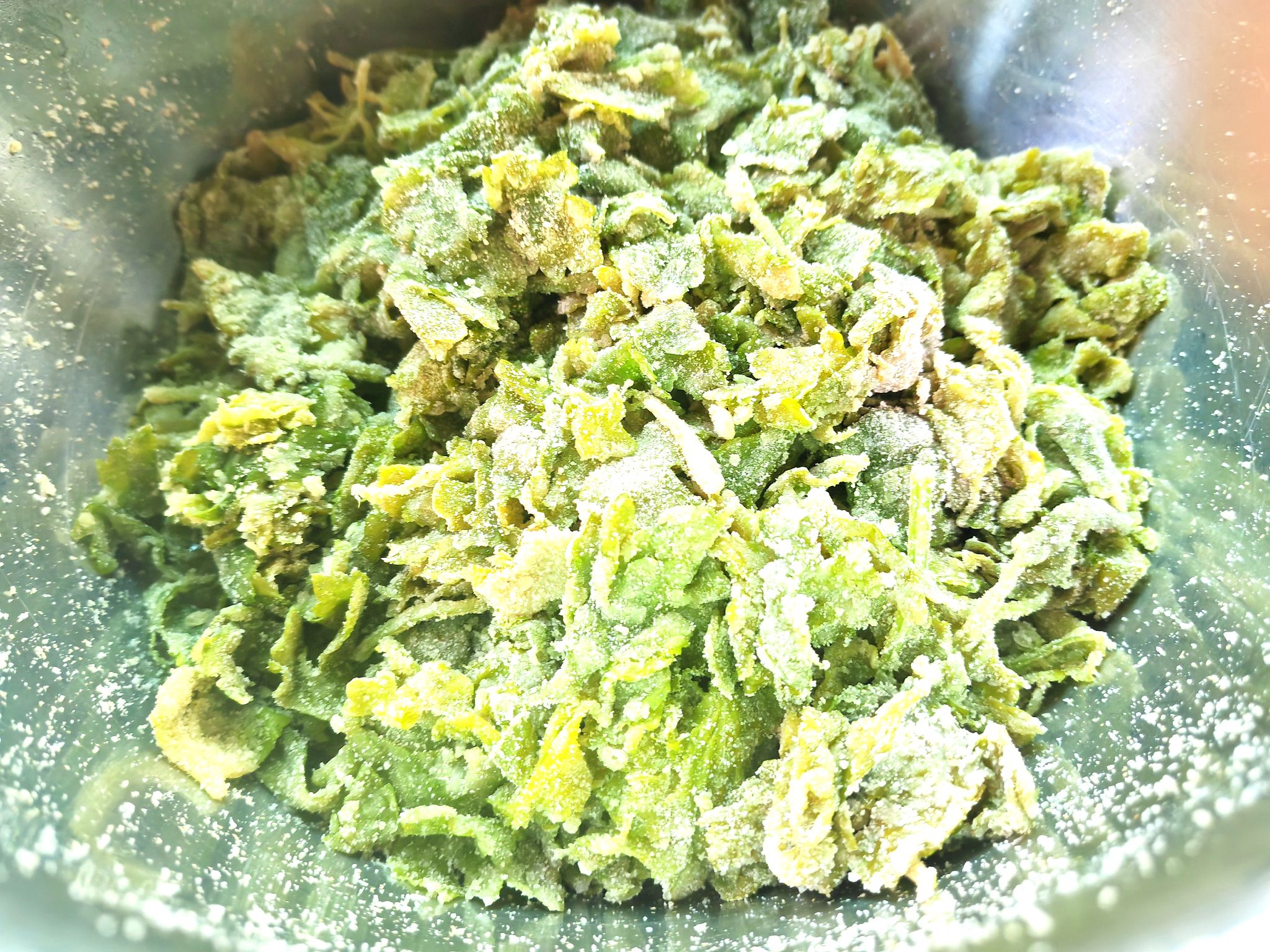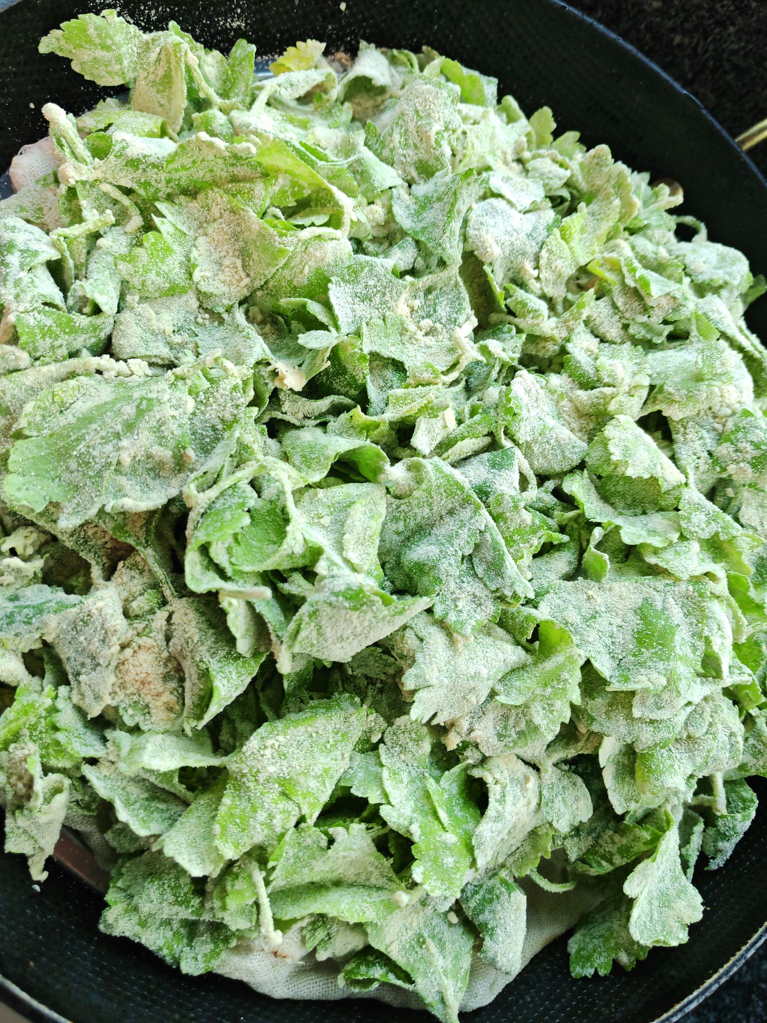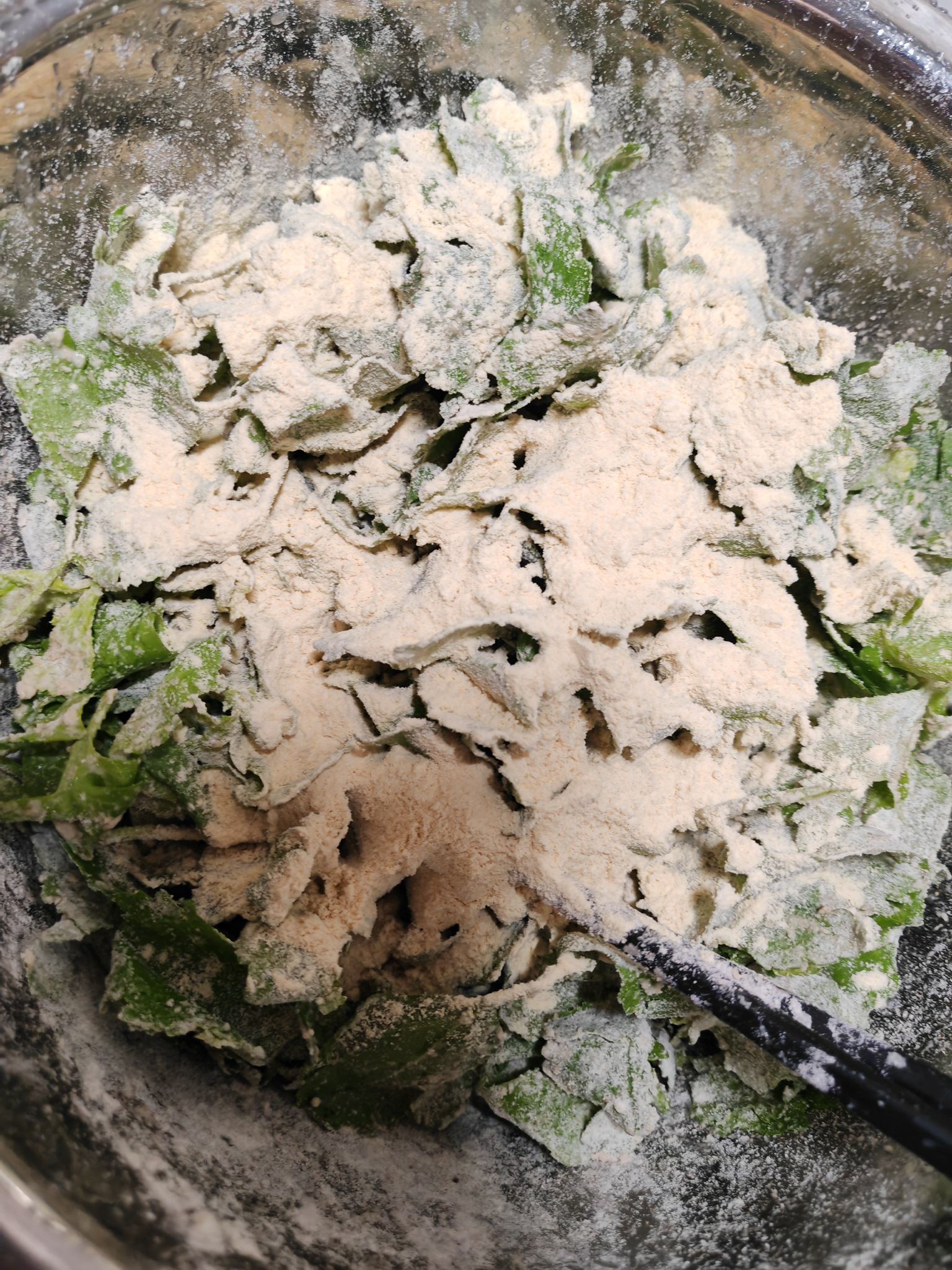 少量多次加入面粉,邊加邊拌,確保每片葉子都能被面粉包裹。家里有玉米粉的,小米粉的,也可以加點,我今天就是加了點小米粉。