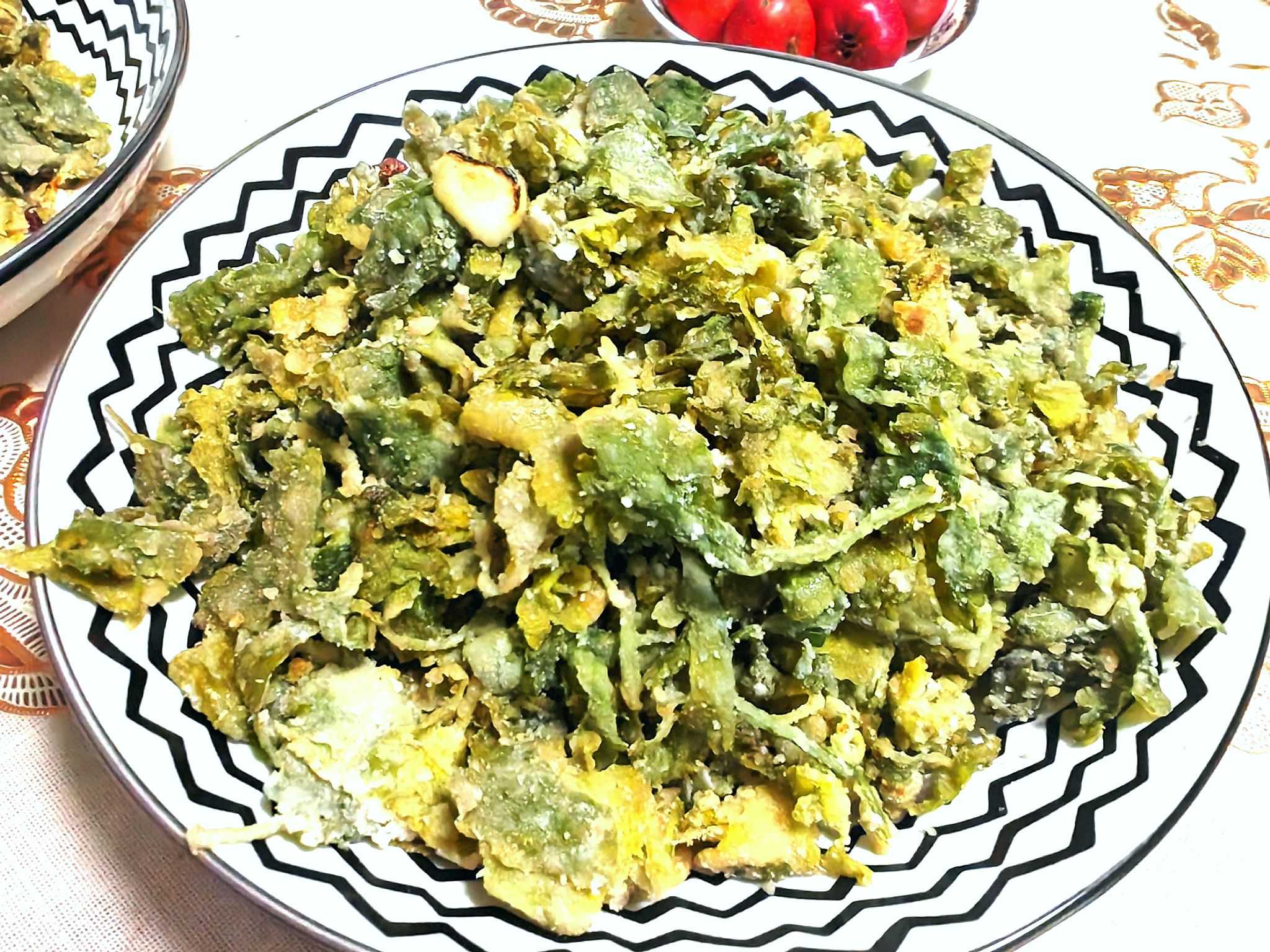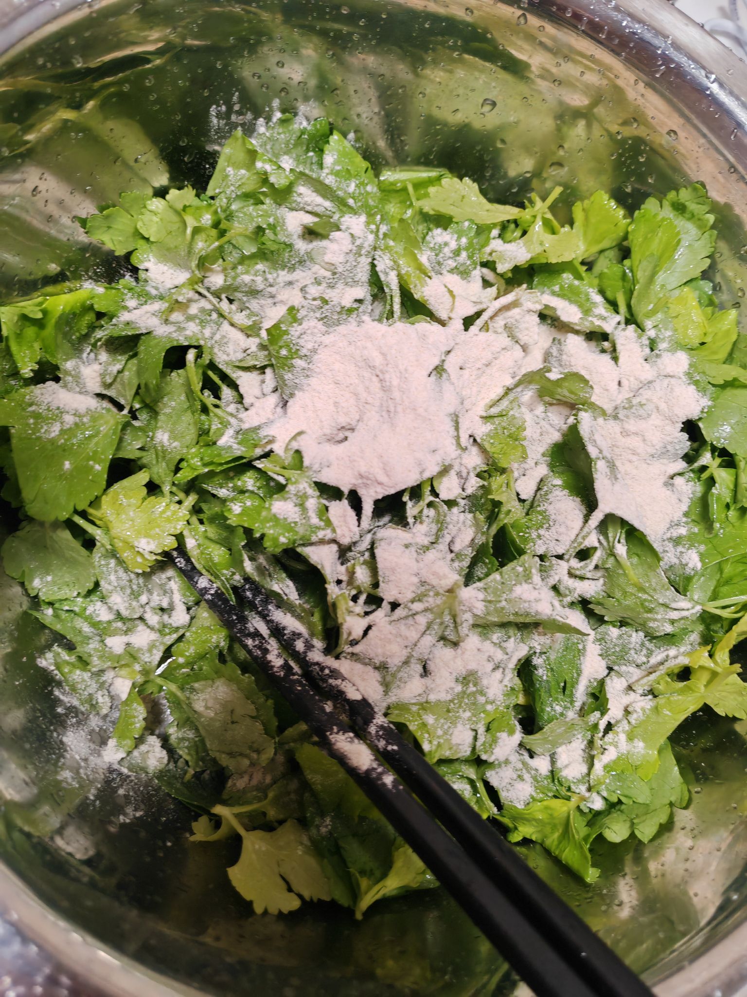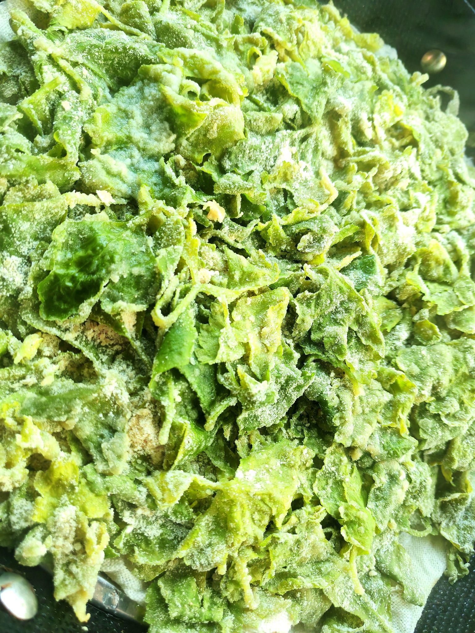 少量多次加入面粉,邊加邊拌,確保每片葉子都能被面粉包裹。家里有玉米粉的,小米粉的,也可以加點,我今天就是加了點小米粉。
