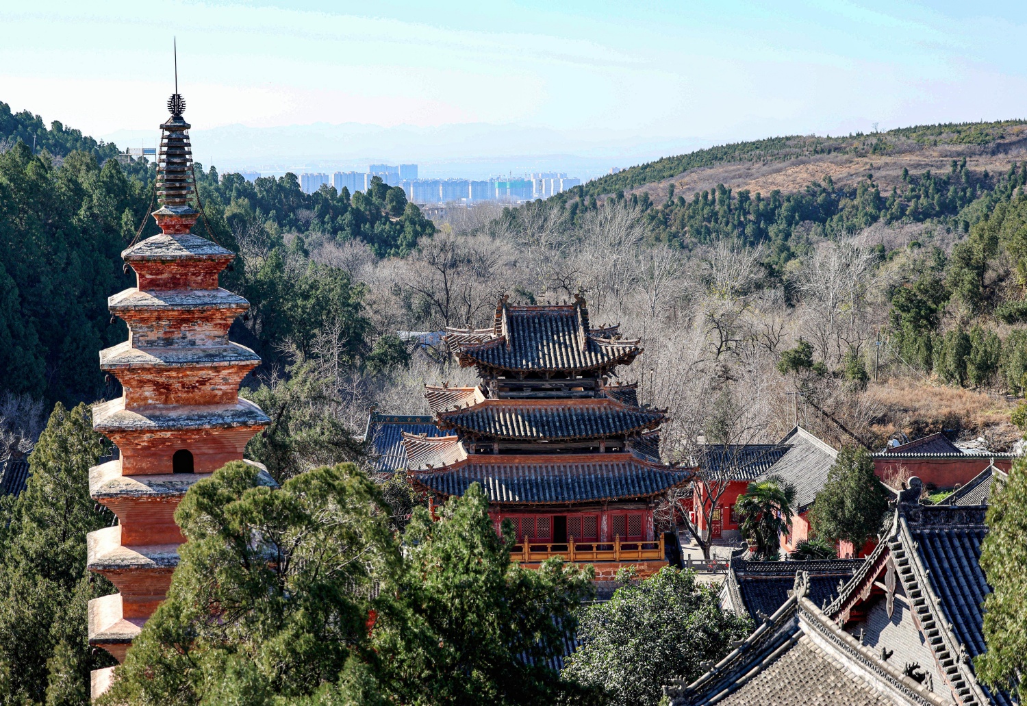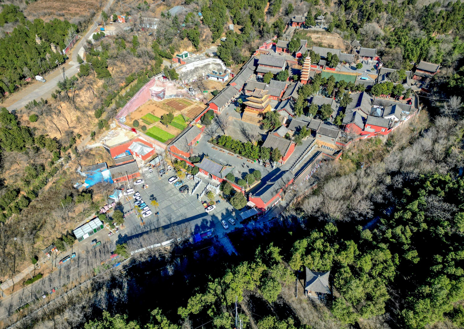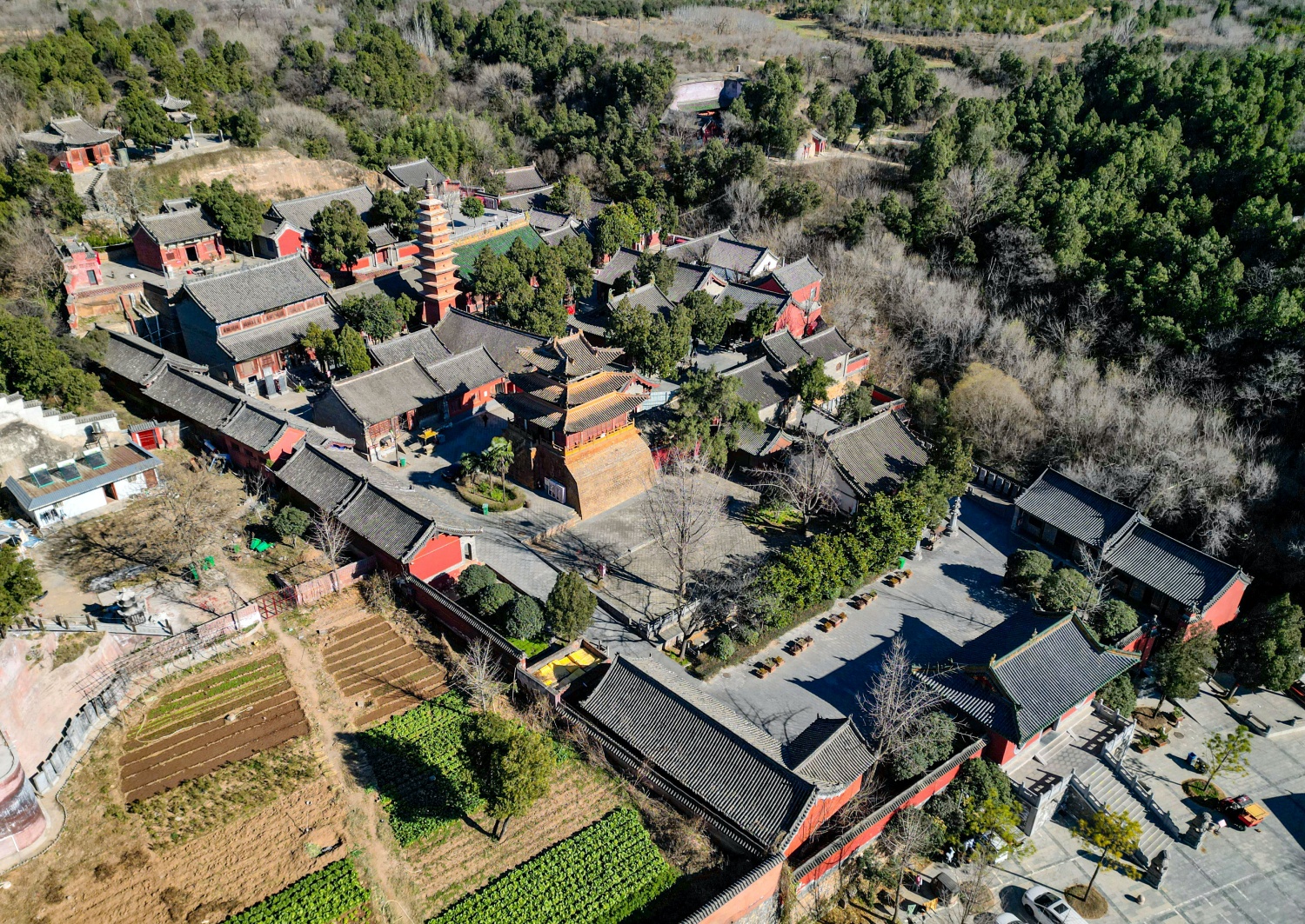 航拍下的風穴寺全景,林中山間紅墻古建錯落,唐塔醒目,盡顯“深山藏剎”格局。