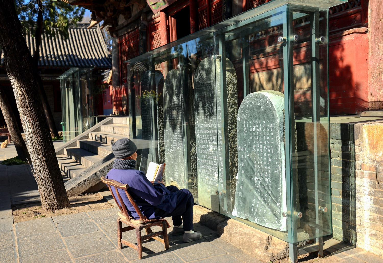 石碑前讀書的比丘尼。