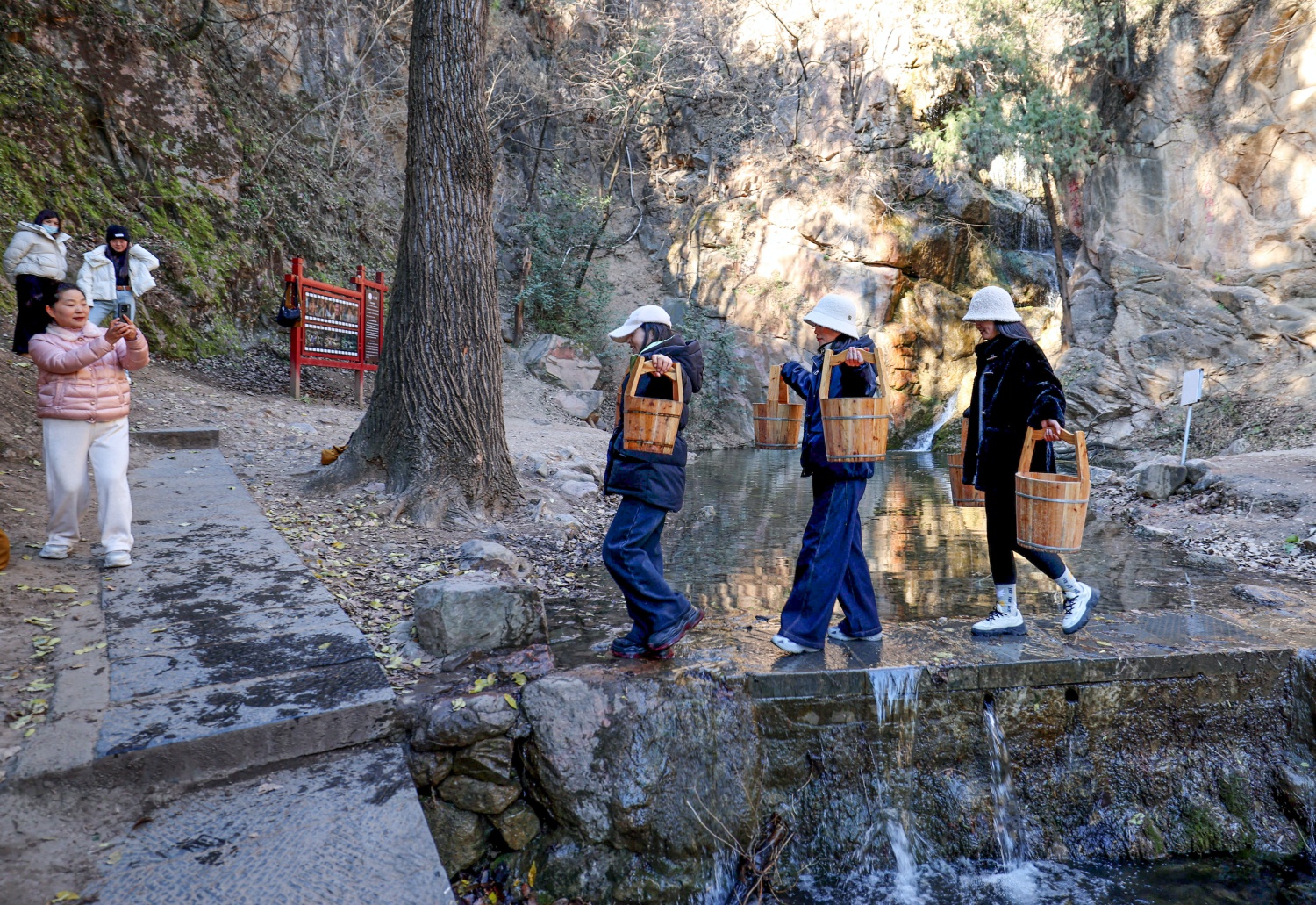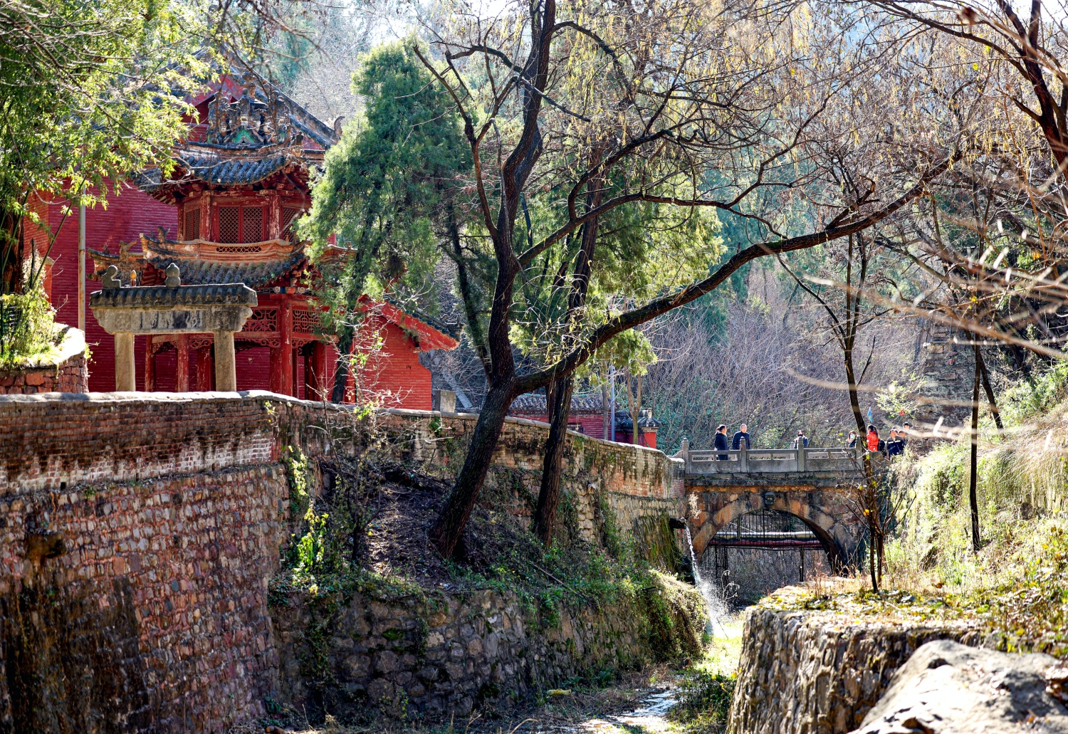 “古建不是博物館里的標本,是能呼吸的生命體。”記者舉著相機,鏡頭里既有中佛殿“減柱造”的宋代技藝,也有游客在石橋上的笑靨——這座宋代石橋名為“接圣橋”,相傳是古代高僧迎接貴客之處,如今橋面上的石板被游人磨得光滑,現代衣衫的身影與古橋倒影重疊,構成古今交融的生動畫面。寺內僧人擦拭銅爐的側影、山澗旁提著木桶的游客、墻角讀書的比丘尼,都成了鏡頭下的點綴,讓這座千年古剎既保留著“禪林幽靜”的本色,又添了幾分鮮活的人間煙火。