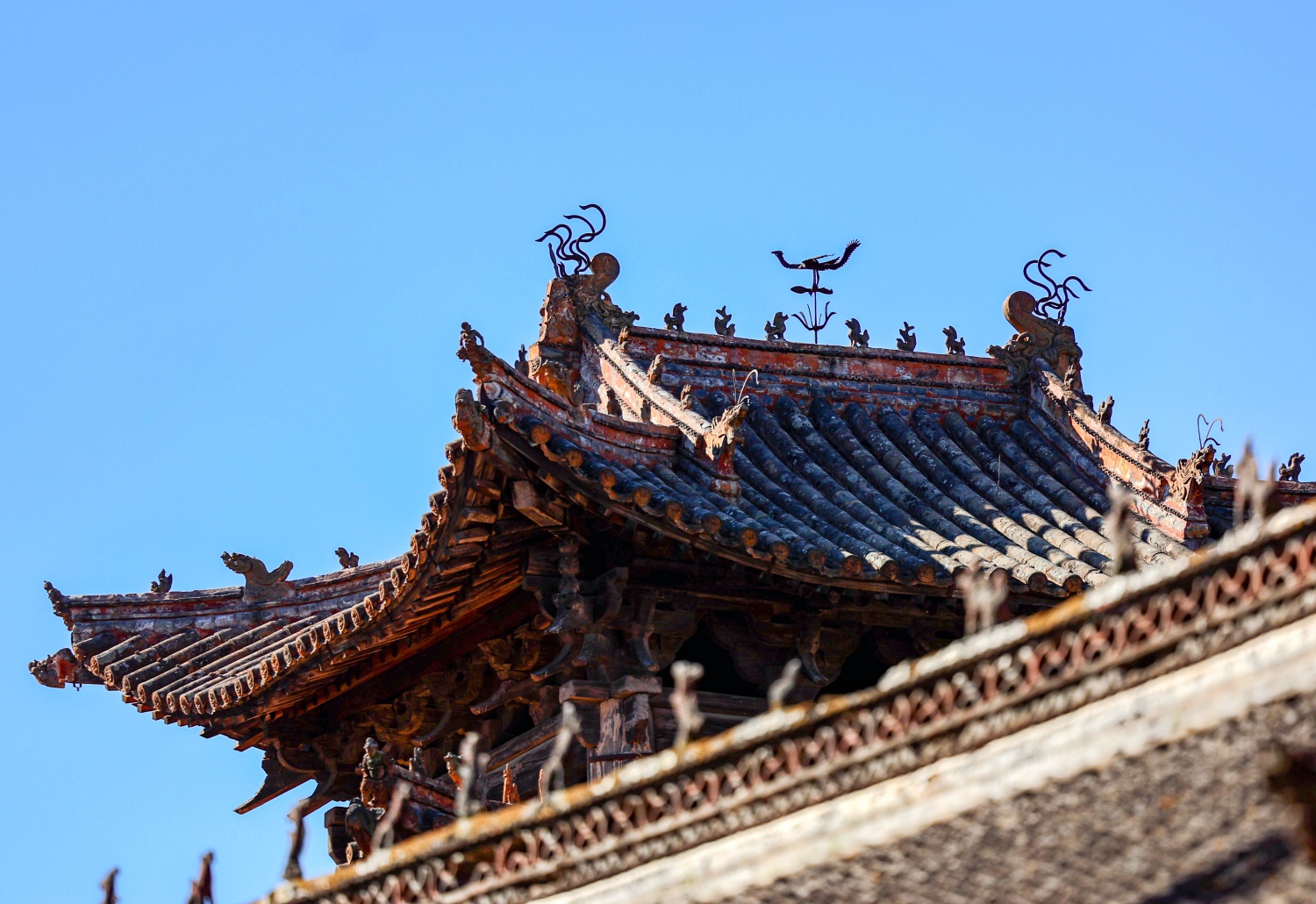 屋頂上的相風烏,古稱“風信儀”,是中國古代觀測風向的儀器。