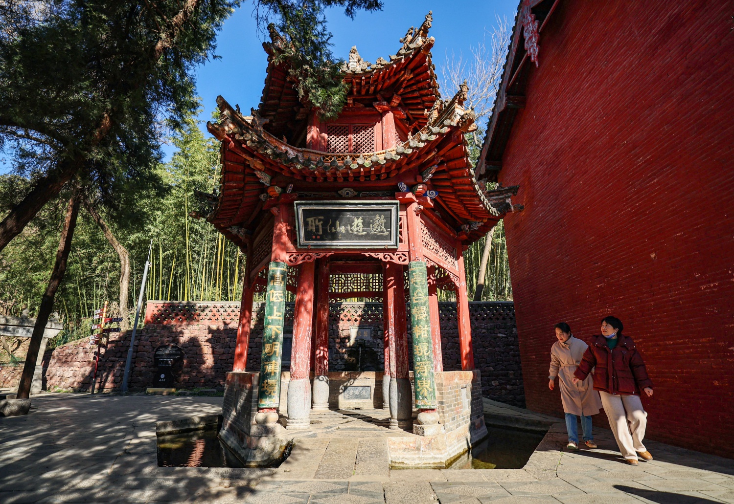 游客在風穴寺內參觀。