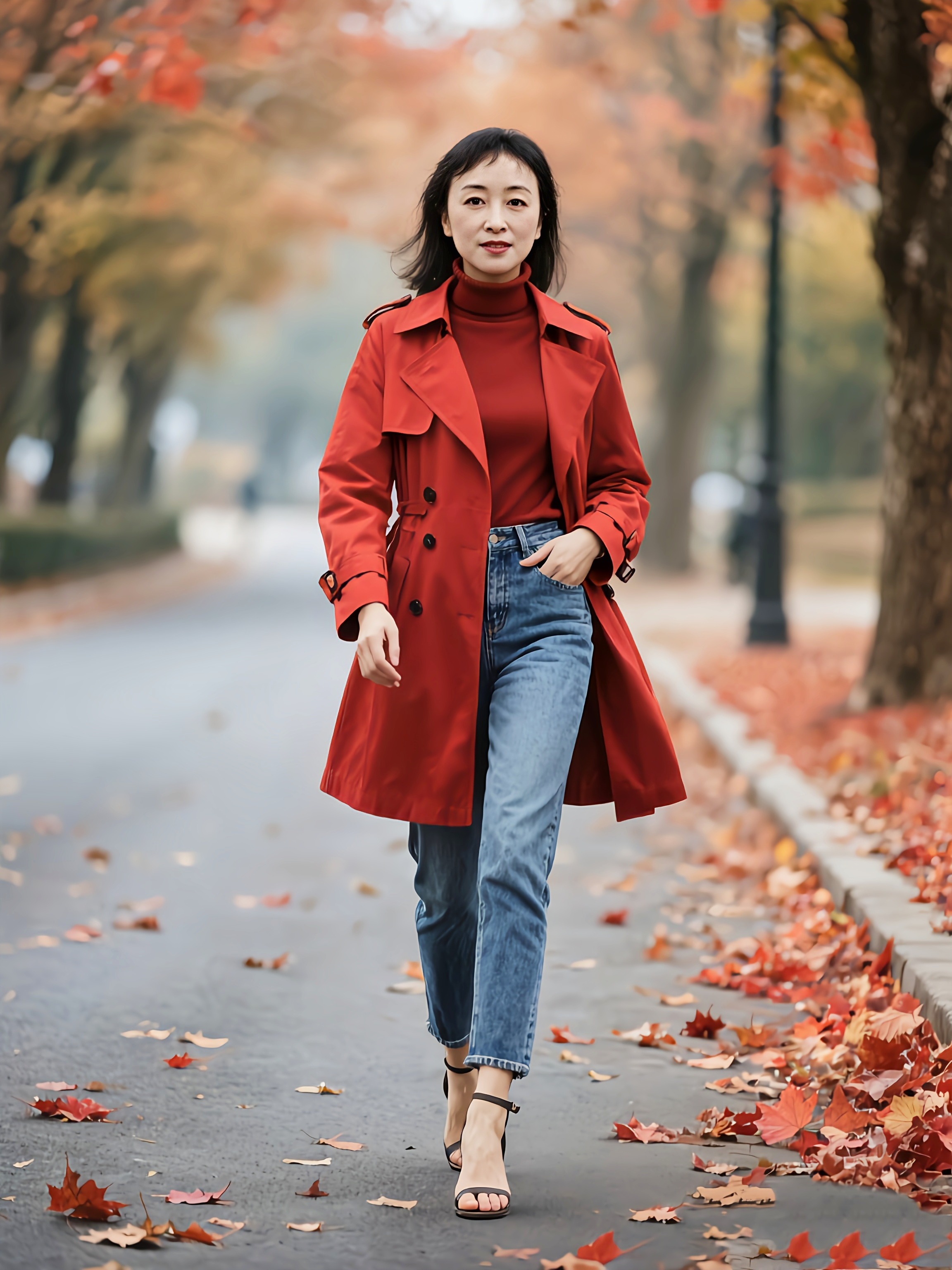牛仔褲的隨性,又讓她多了幾分不被定義的灑脫。生活從不會按部就班,她也從不愿被“年齡”“性別”的標簽束縛。可以穿著紅風衣在職場上雷厲風行,也能踩著帆布鞋在楓徑上隨性漫步;可以精心打扮赴一場約會,也能素面朝天在家煮一碗熱湯。這份在不同角色間切換的從容,這份不被世俗定義的灑脫,正是歲月賦予她的女性力量。