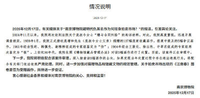 近日,有關媒體關于“南京博物院藏明代仇英名作為何現身拍賣市場?”的報道,引發輿論關注。12月17日晚間,南京博物院發布通報,進行回應。