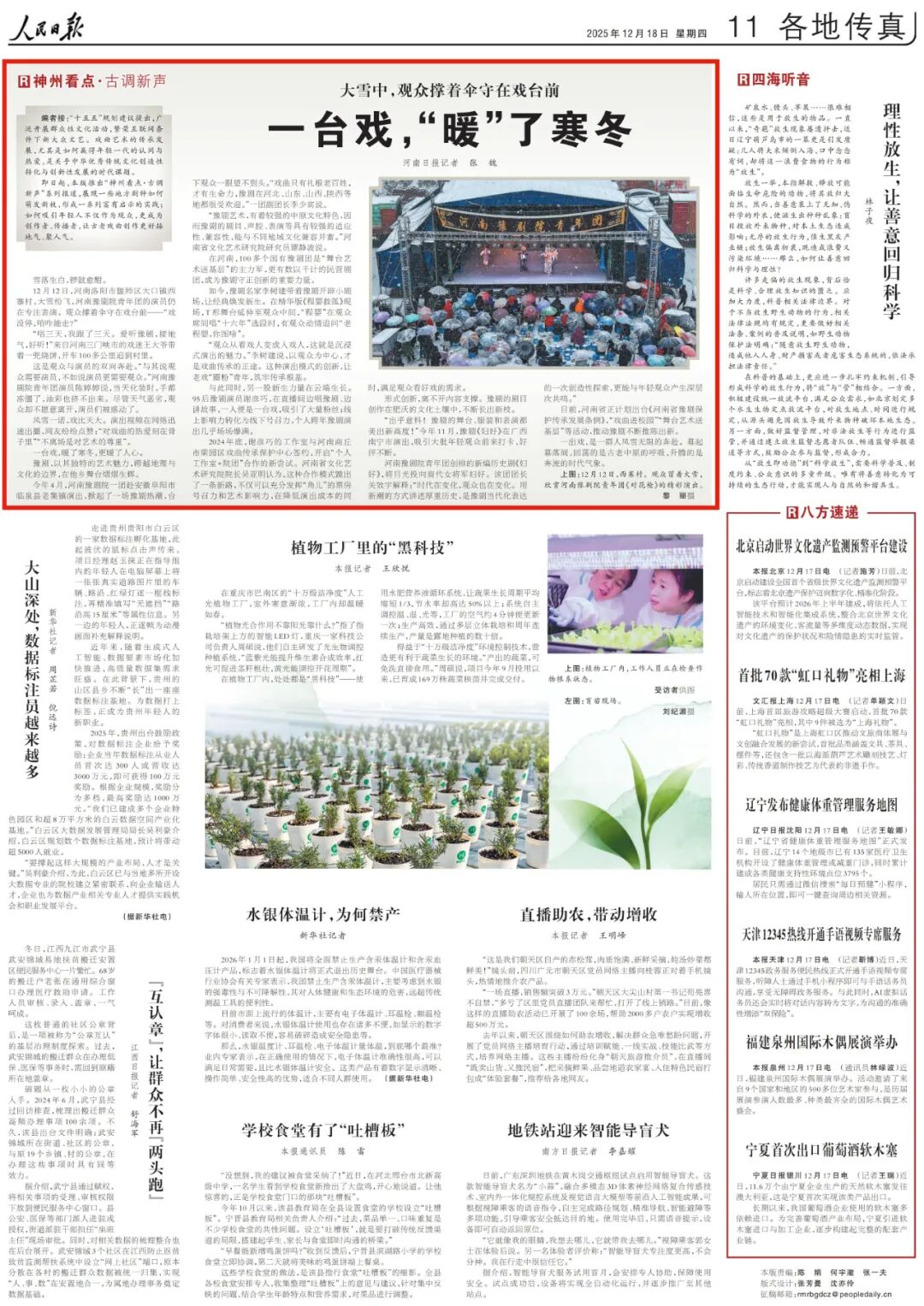 12月12日,河南洛陽市偃師區大口鎮西寨村,大雪紛飛,河南豫劇院青年團的演員仍在專注表演。觀眾撐著傘守在戲臺前——“戲沒停,咱咋能走?”