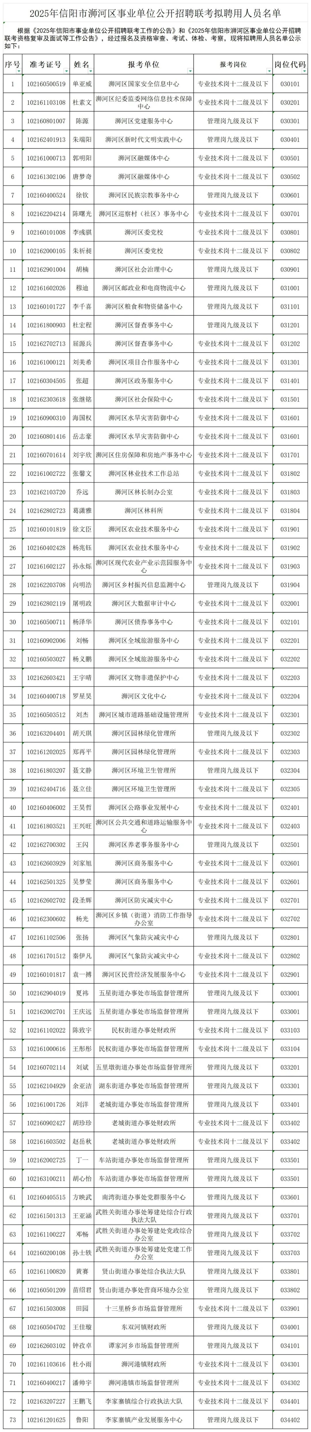 根據(jù)《2025年信陽市事業(yè)單位公開招聘聯(lián)考工作的公告》和《2025年信陽市浉河區(qū)事業(yè)單位公開招聘聯(lián)考資格復(fù)審及面試等工作公告》,經(jīng)過報(bào)名及資格審查、考試、體檢、考察,現(xiàn)將擬聘用人員名單公示如下: