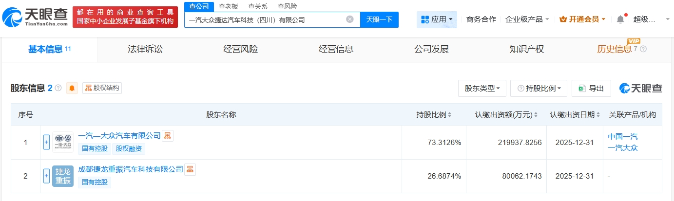 雷達財經訊,天眼查工商信息顯示,近日,一汽大眾捷達汽車科技(四川)有限公司成立,法定代表人為聶強,注冊資本30億人民幣,經營范圍包括汽車零部件及配件制造、電動機制造、智能車載設備制造、道路機動車輛生產等。股東信息顯示,該公司由一汽—大眾汽車有限公司、成都捷龍重振汽車科技有限公司共同持股。