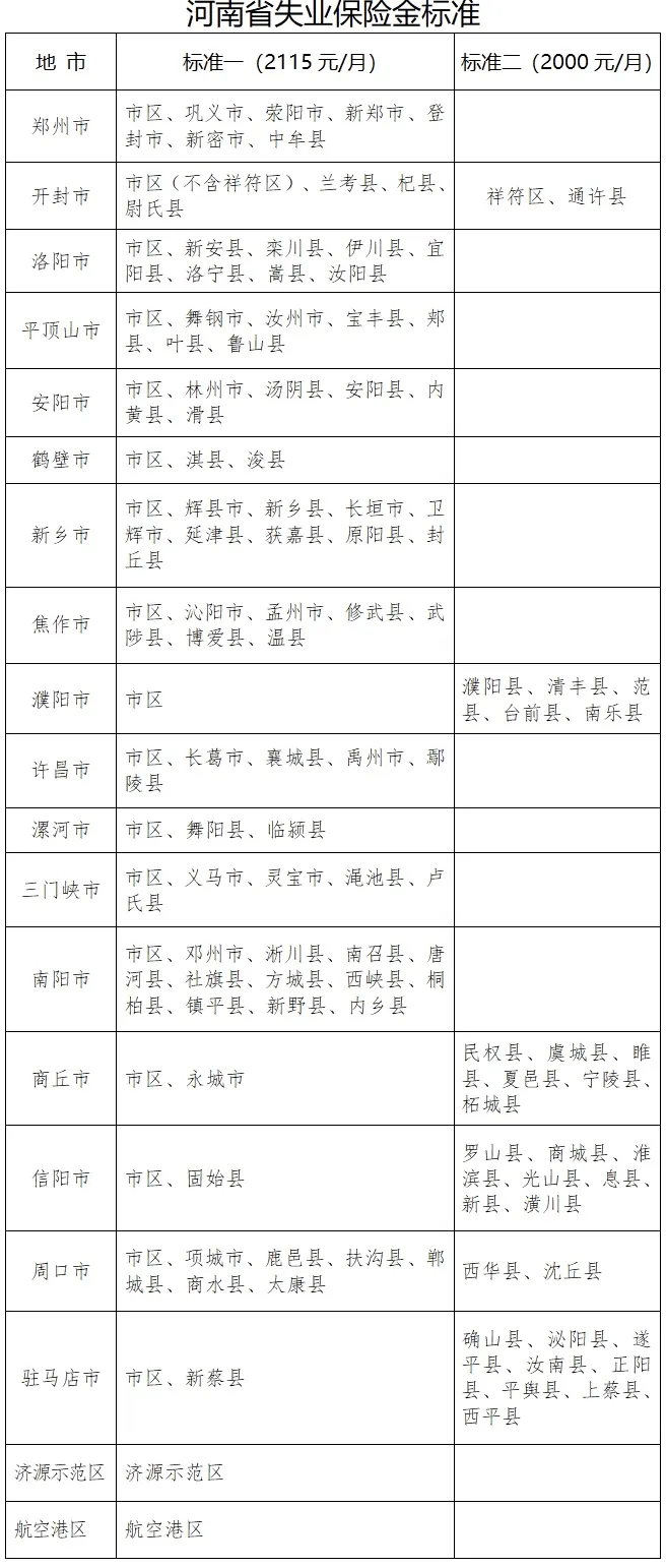 根據(jù)通知,失業(yè)保險金基本標準按照全省一類行政區(qū)域月最低工資標準的百分之九十確定,調(diào)整為2115元/月。其中,基本標準高于最低工資標準的三類行政區(qū)域,失業(yè)保險金標準按照不高于所在地最低工資標準確定,調(diào)整為2000元/月。納入省直統(tǒng)籌的失業(yè)保險參保單位,失業(yè)保險金標準參照鄭州市市區(qū)標準執(zhí)行。調(diào)整標準所需資金由失業(yè)保險基金列支。