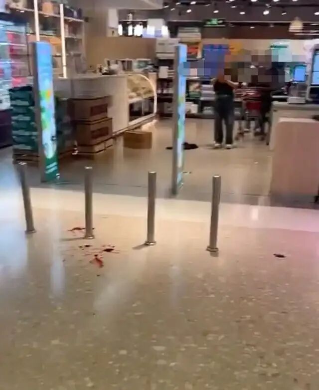 現(xiàn)場(chǎng)視頻顯示,一男子身穿黑衣、頭戴黑色鴨舌帽,戴著黑色口罩走在商場(chǎng)地下一層的走廊內(nèi),目擊者指稱(chēng)其為傷人者,男子行進(jìn)路線(xiàn)前方的市民倉(cāng)皇逃離。視頻中拍到,一超市門(mén)口地面有血跡。