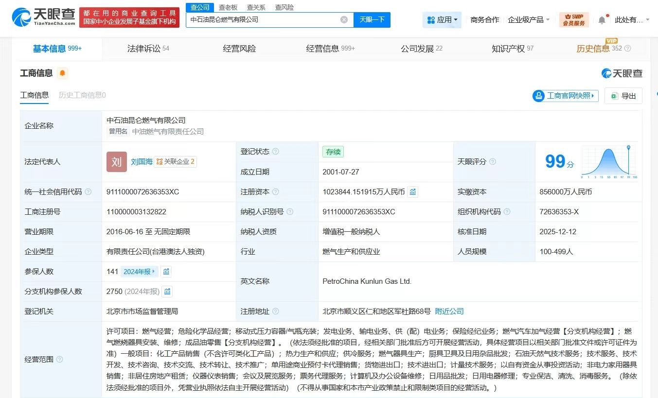 天眼查App顯示,近日,中石油昆侖燃氣有限公司發生工商變更,注冊資本由85.6億人民幣增至約102.4億人民幣,增幅約20%。