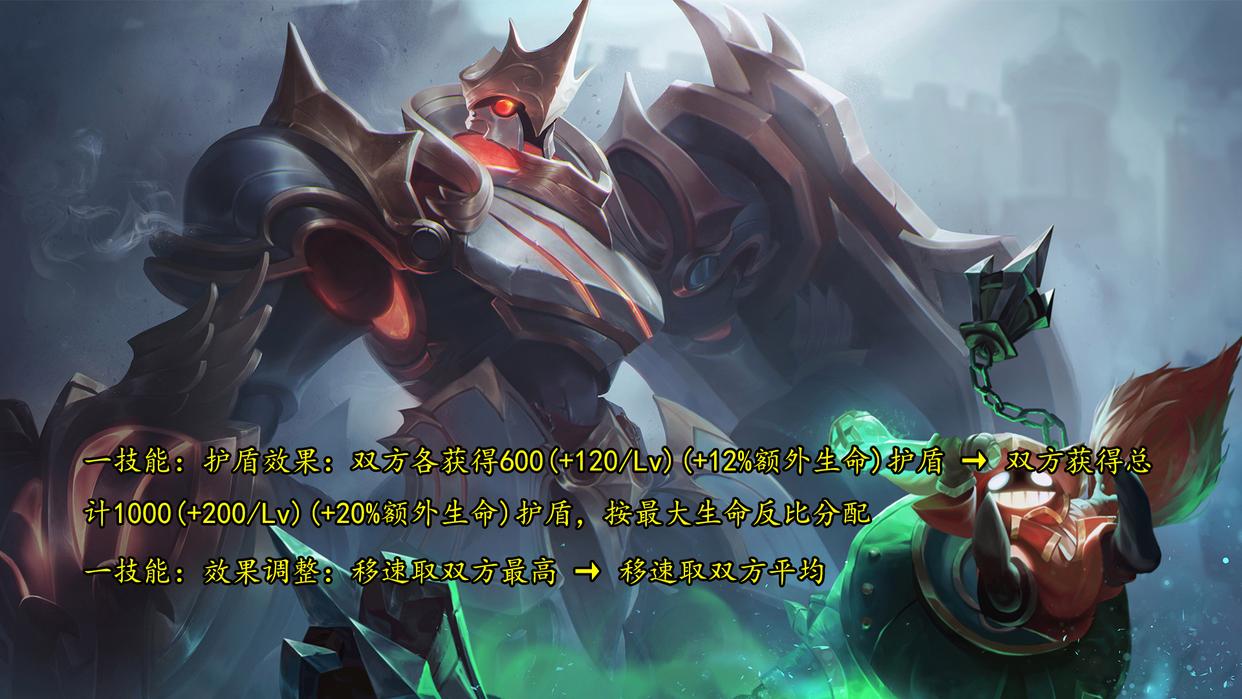 不僅如此,在此次版本更新中,對盾山1技能的移速也進行了削弱,當托舉隊友時,移速將不會直接獲取到雙方的最高,而是變為了獲取雙方的平均值,也就是說,這樣一來,盾山在托舉隊友之后,移速將不會再有太大的優勢,不過個人覺得如果沒有疾步之靴或者加速效果的話,這個影響將不會很大。