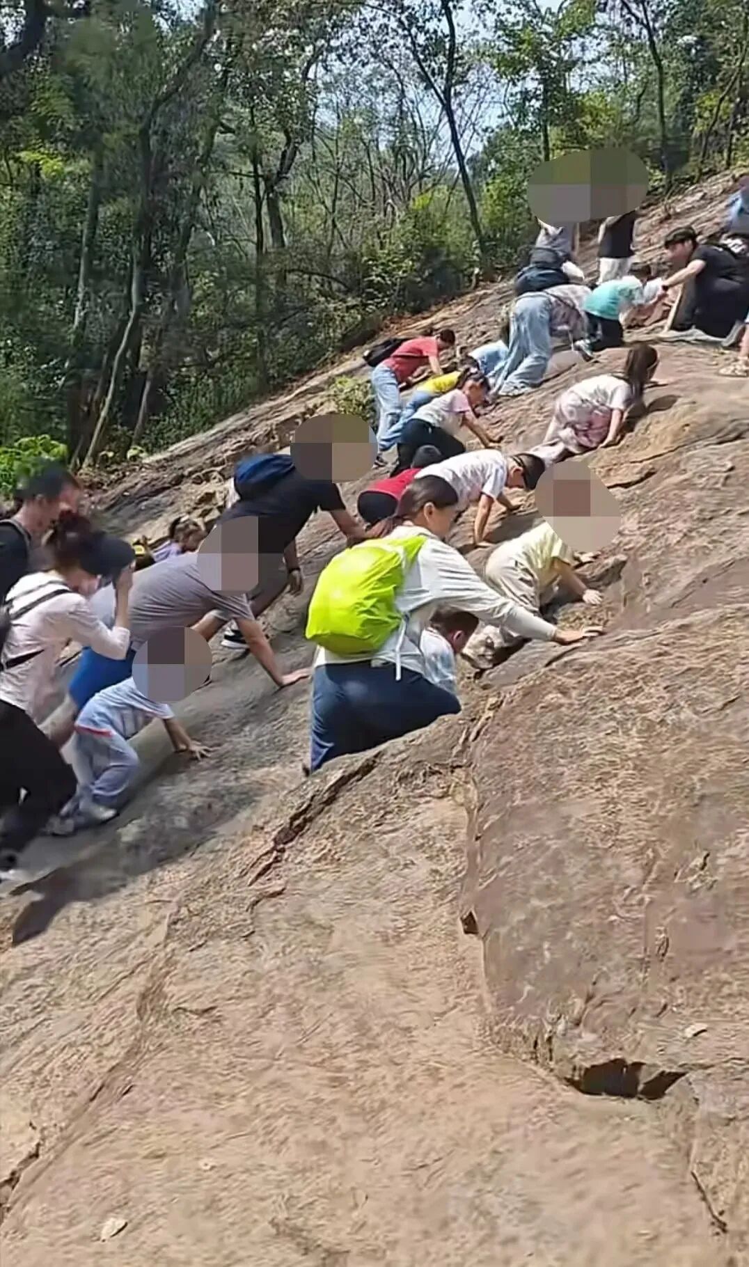 “絕望坡”最陡處近70度,腳下碎石一踩就滑,游客只能手腳并用抓著巖石或樹(shù)叢攀爬,且現(xiàn)場(chǎng)毫無(wú)安全措施。