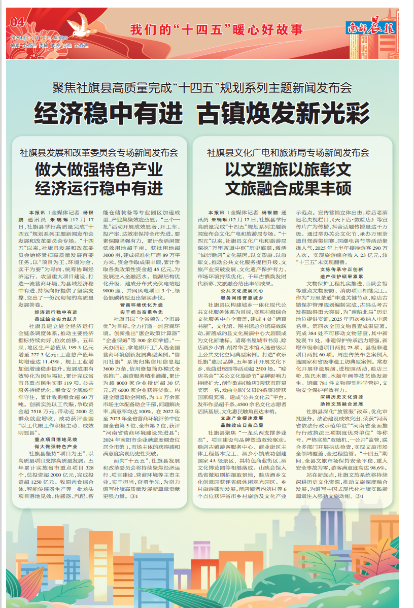 12月17日,社旗縣舉行高質(zhì)量完成“十四五”規(guī)劃系列主題新聞發(fā)布會發(fā)展和改革委員會專場?!笆奈濉币詠?,社旗縣發(fā)展和改革委員會始終緊扣高質(zhì)量發(fā)展首要任務(wù),以“項目為王、環(huán)境為金、實干為要”為導(dǎo)向,統(tǒng)籌協(xié)調(diào)經(jīng)濟(jì)運(yùn)行,攻堅重大項目建設(shè),打造一流營商環(huán)境,為縣域經(jīng)濟(jì)穩(wěn)中有進(jìn)、持續(xù)向好提供了堅實支撐,交出了一份沉甸甸的高質(zhì)量發(fā)展答卷。