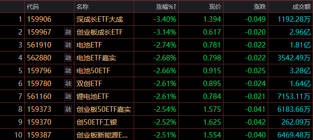 深成長ETF大成(159906)領跌3.4%,創業板成長ETF(159967)跌3.14%,電池ETF(561910)跌2.74%。