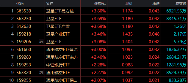 ETF收盤漲跌不一,衛星ETF易方達(563530)領漲3.80%,衛星ETF廣發(512630)漲3.69%,衛星ETF(563230)漲3.69%。