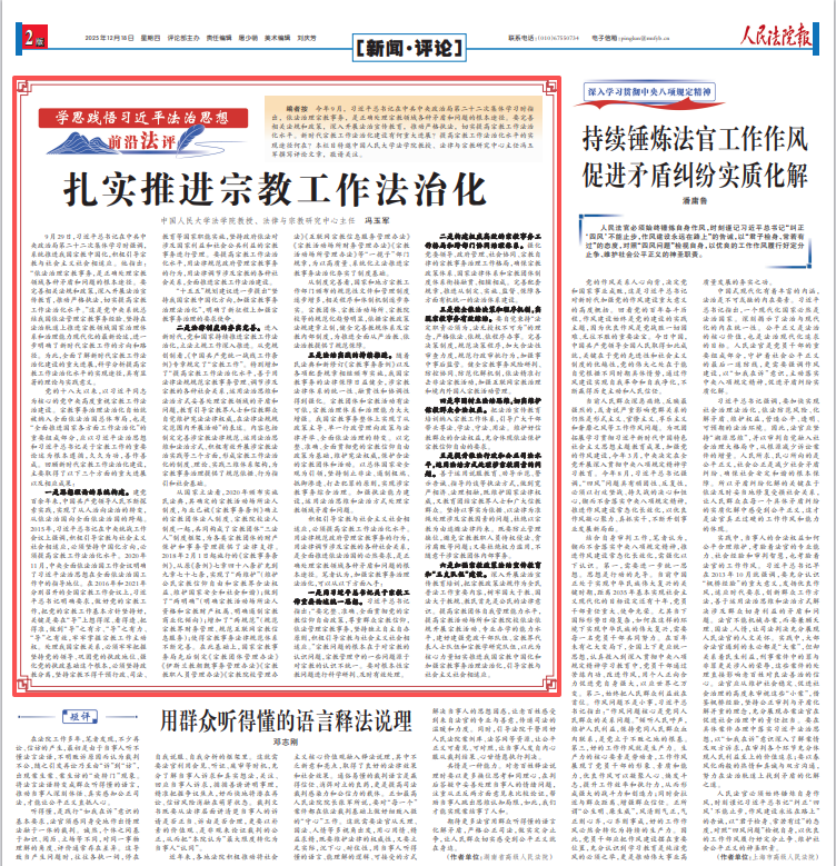 2025年是確立習(xí)近平法治思想在全面依法治國中的指導(dǎo)地位五周年。為進(jìn)一步學(xué)習(xí)貫徹習(xí)近平法治思想的核心要義、豐富內(nèi)涵、實(shí)踐要求,集中展現(xiàn)在習(xí)近平法治思想引領(lǐng)下法治中國建設(shè)的新成效,人民法院報(bào)二版開設(shè)重要評論欄目“學(xué)思踐悟習(xí)近平法治思想?前沿法評”。本欄目立足時代前沿、法治前沿,聚焦黨中央最新決策部署和習(xí)近平總書記最新重要講話精神尤其是關(guān)于法治建設(shè)的重要指示要求,緊密結(jié)合國家最新出臺的法律法規(guī)以及最高人民法院最新工作部署、最新出臺的司法解釋和司法文件等,邀請法學(xué)理論界和司法實(shí)務(wù)界的知名專家學(xué)者和有關(guān)領(lǐng)導(dǎo),及時撰文進(jìn)行評論發(fā)聲,大力弘揚(yáng)和傳播社會主義法治正能量,為推動法治中國建設(shè)、助力實(shí)現(xiàn)中國式現(xiàn)代化,匯聚智識力量,營造良好的輿論氛圍。敬請關(guān)注!