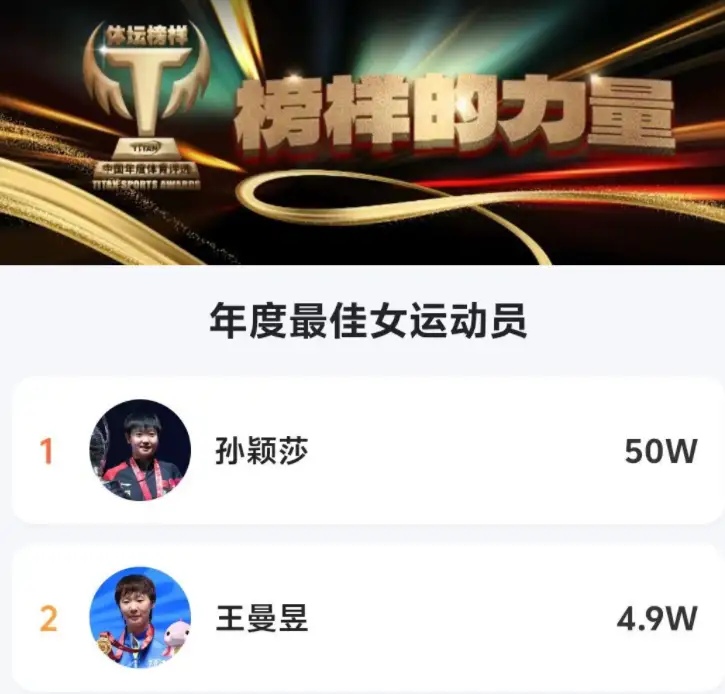 而在另一個國內平臺舉辦的“年度能量人物”評選活動中,孫穎莎的得票率也是斷檔領先,拿下獎項只剩下時間的問題。