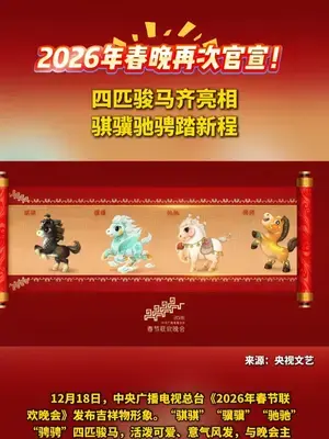 四匹駿馬齊亮相,騏驥馳騁踏新程!12月18日,中央廣播電視總臺《2026年春節聯歡晚會》發布吉祥物形象。“騏騏”“驥驥”“馳馳”“騁騁”四匹駿馬,活潑可愛、意氣風發,與晚會主題“騏驥馳騁 勢不可擋”一脈相承、相得益彰。吉祥物的設計靈感來源于中國不同時期馬的經典形象,并將流云紋、山云紋等千年紋樣“穿”上身,充盈著生生不息的歷史美感和萬象更新的時代氣象,飽含馬到成功、前程似錦的美好寓意。