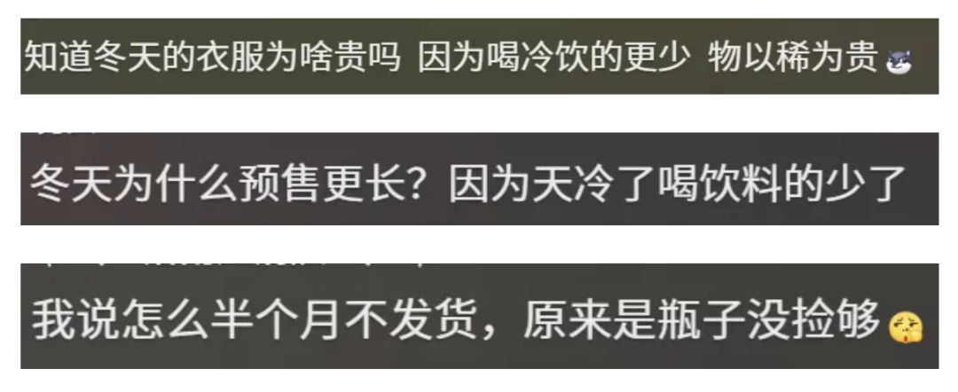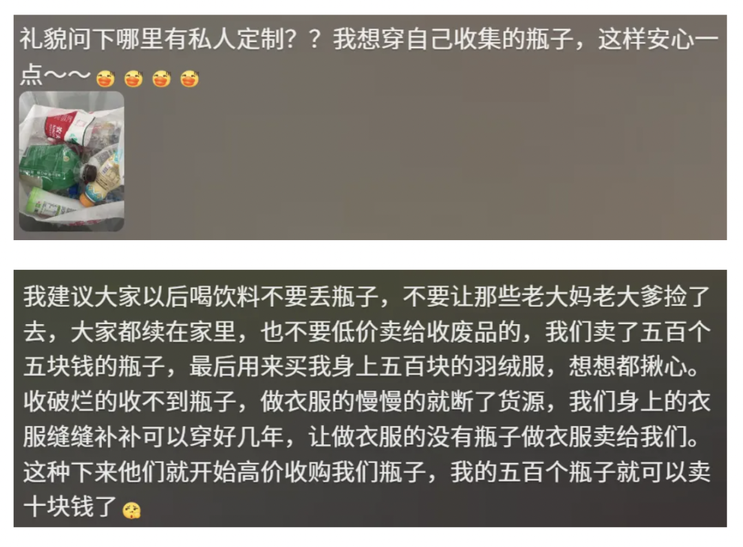 比如“上學的時候校服袖口和屁股被磨得油亮,原來是塑料拋光了”“衣服預售半個月不發貨,是瓶子還沒撿夠吧”。