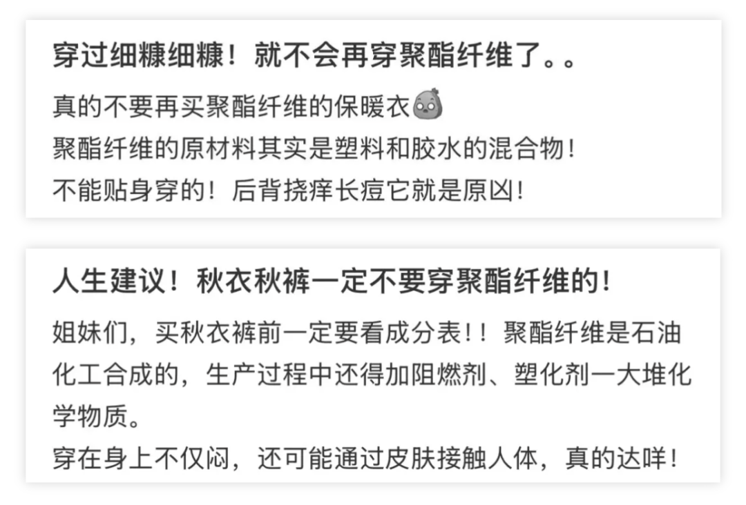 博主的提醒是好心,科普也在理,但大家學著學著就難免留下“聚酯纖維沒一個好東西”的印象,盡管這是品牌商用料不夠好造成的。