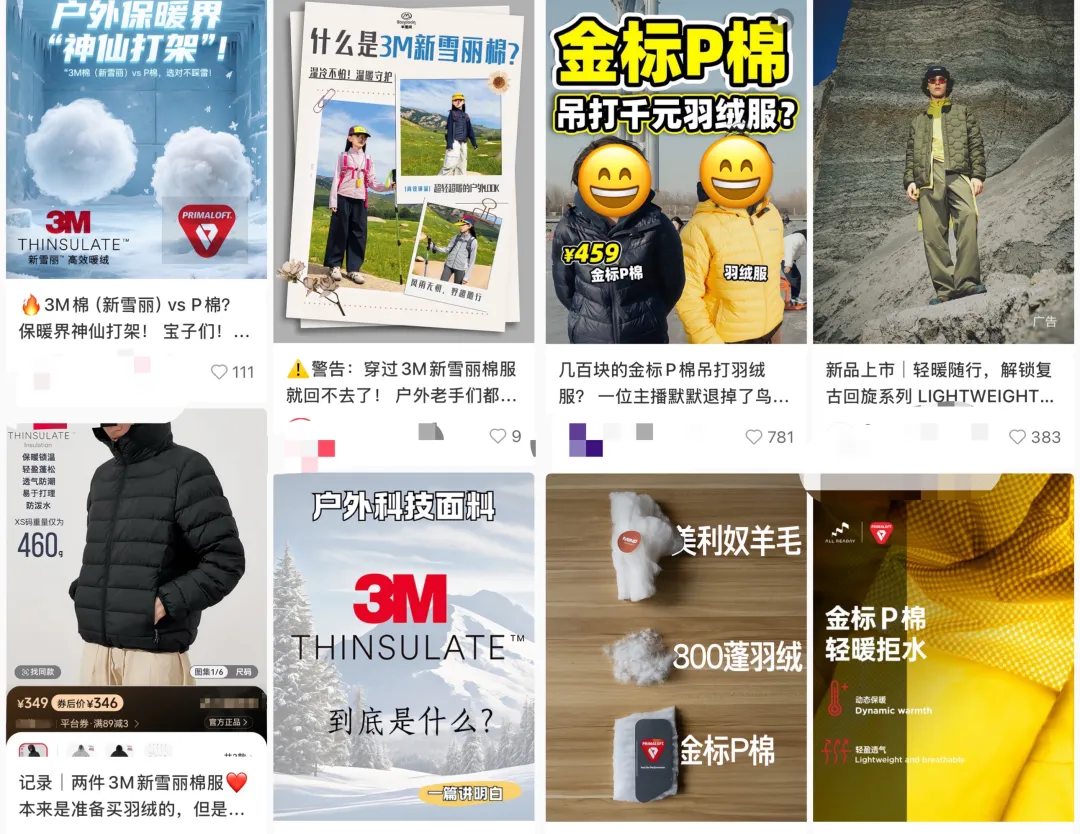 還有相對小眾,但很受戶外品牌重用的P棉、新雪麗棉,憑借不輸羽絨的保暖鎖溫能力,突出的拒水性、輕量性,以及結構穩定,不怕水洗、壓縮等優點,成了戶外圈的新貴。
