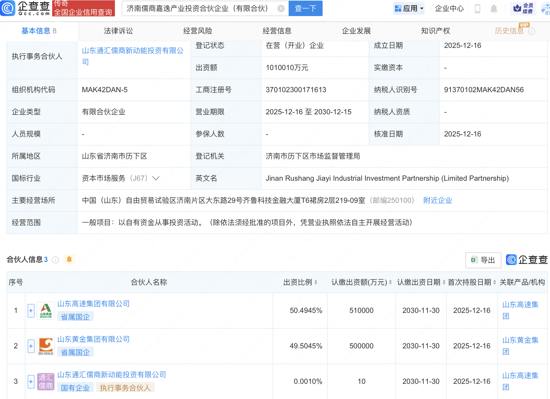 企查查APP顯示,近日,濟南儒商嘉逸產業投資合伙企業(有限合伙)成立,出資額約101億元,經營范圍包含:以自有資金從事投資活動。企查查股權穿透顯示,該企業由山東高速集團有限公司、山東黃金集團有限公司、山東通匯儒商新動能投資有限公司共同出資。