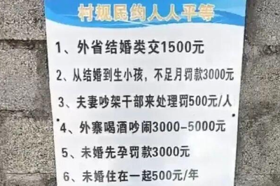 從結(jié)婚到生小孩不足月罰款3000元;未婚先孕罰款3000元;夫妻吵架干部來(lái)處理罰500元/人;未婚同居每年交500元……近日,一村莊張貼的“村規(guī)民約人人平等”告示中出現(xiàn)上述內(nèi)容,引發(fā)爭(zhēng)議。12月17日,當(dāng)?shù)劓?zhèn)政府稱(chēng)是村小組自行決定,并未報(bào)備,目前已將相關(guān)告示撤下(據(jù)12月17日《新京報(bào)》)。