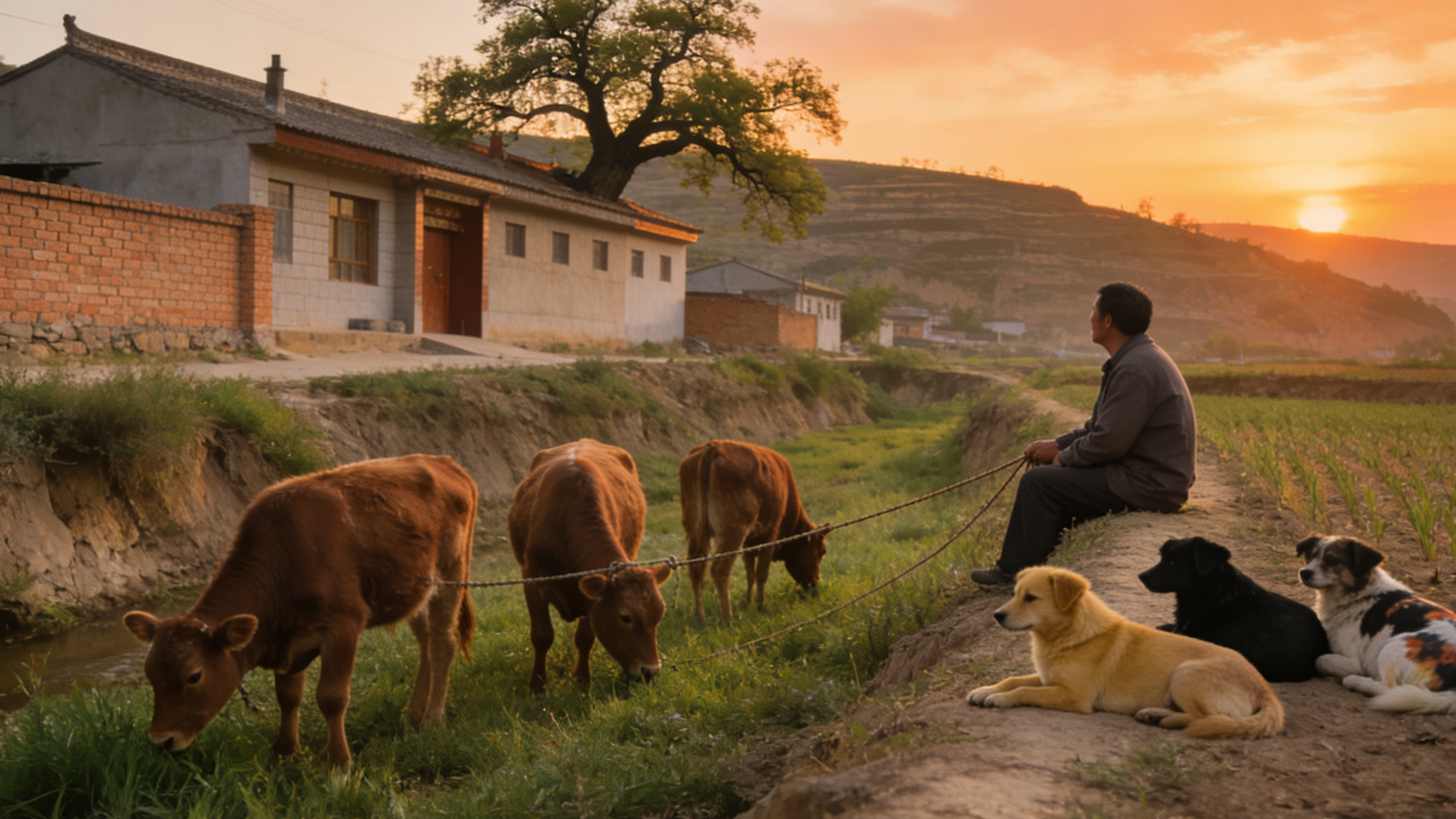 他在門口搭了個狗窩,養(yǎng)了三只土狗,黃的、黑的、花的,看門護院,見了生人就汪汪叫,見了老李卻溫順得像小貓。又從集市上買回三頭小牛犢,棕褐色的皮毛油光水滑,哞哞叫著跟在他身后。每日清晨,老李牽著牛繩,踱到村后的溝里放牧,青草嫩得能掐出水,小牛低著頭啃草,他便坐在田埂上,望著遠處的塬坡發(fā)呆。碰見相熟的村民,他便咧開嘴嘿嘿地笑,露出兩排潔白的牙,眉眼間滿是舒展,手里的牛鞭輕輕晃著,卻從不往牛身上抽。