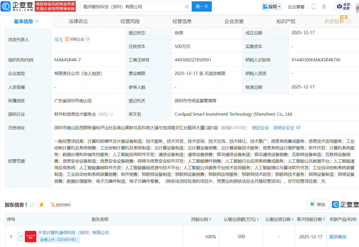 企查查APP顯示,近日,酷派智投科技(深圳)有限公司成立,法定代表人為馬飛,注冊資本500萬元,經營范圍包含計算機軟硬件及外圍設備制造、人工智能應用軟件開發、人工智能硬件銷售等。企查查股權穿透顯示,該公司由酷派集團關聯的宇龍計算機通信科技(深圳)有限公司全資持股。