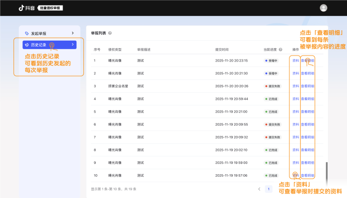 圖:抖音PC端批量侵權舉報工具支持查詢歷史記錄