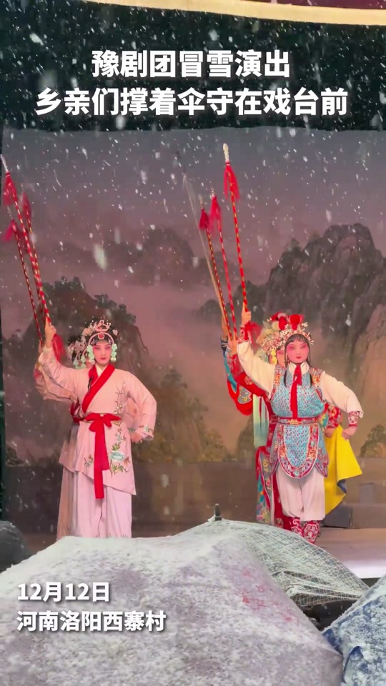 【這場(chǎng)雙向奔赴好暖!#洛陽(yáng)老鄉(xiāng)雪中撐傘看豫劇#】12月12日,河南洛陽(yáng)市偃師區(qū)大口鎮(zhèn)西寨村,大雪紛飛。臺(tái)上,河南豫劇院青年團(tuán)演員仍在表演;臺(tái)下,觀眾撐著傘守在戲臺(tái)前。演員陳婷婷說:“與其說觀眾需要演員,不如說演員更需要觀眾。”#大雪里臺(tái)上堅(jiān)持演臺(tái)下?lián)蝹憧?(視頻/掌上洛陽(yáng))
