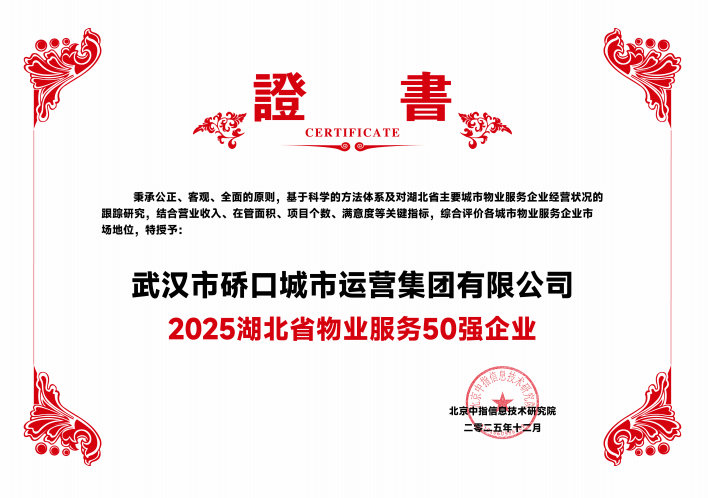 硚口城運集團堅守“提升城市品質、創造美好生活”初心,榮獲“2025湖北省物業服務50強企業”。