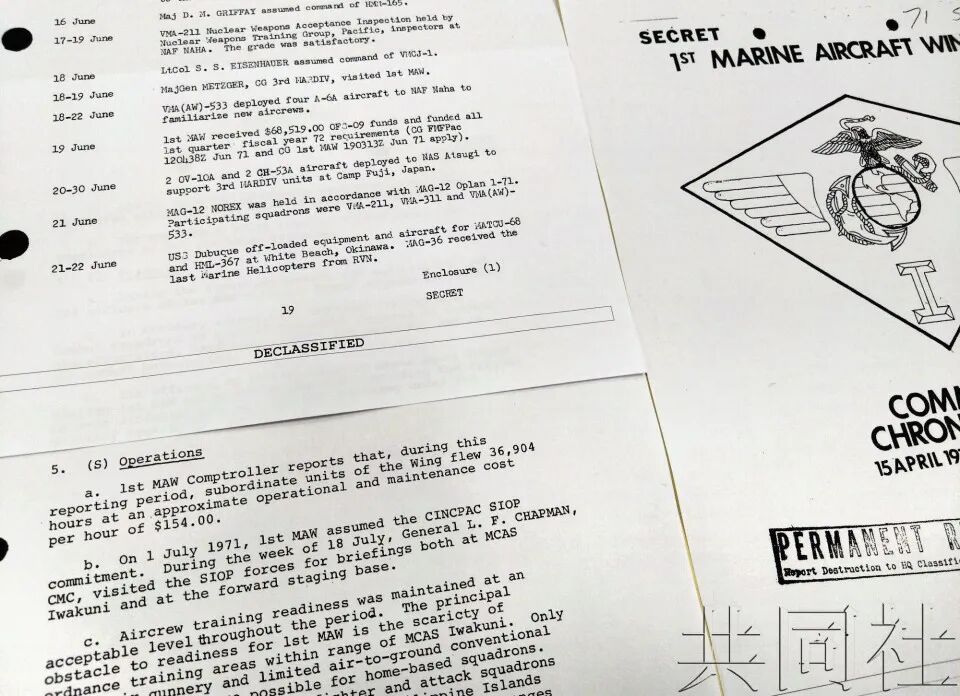 報道稱,這份被解密的文件是美軍在1970至1974年的官方記錄,由司令部設(shè)在巖國的第一海軍陸戰(zhàn)航空團及其下屬部隊制作。這份文件此前保存在美國國家檔案館。