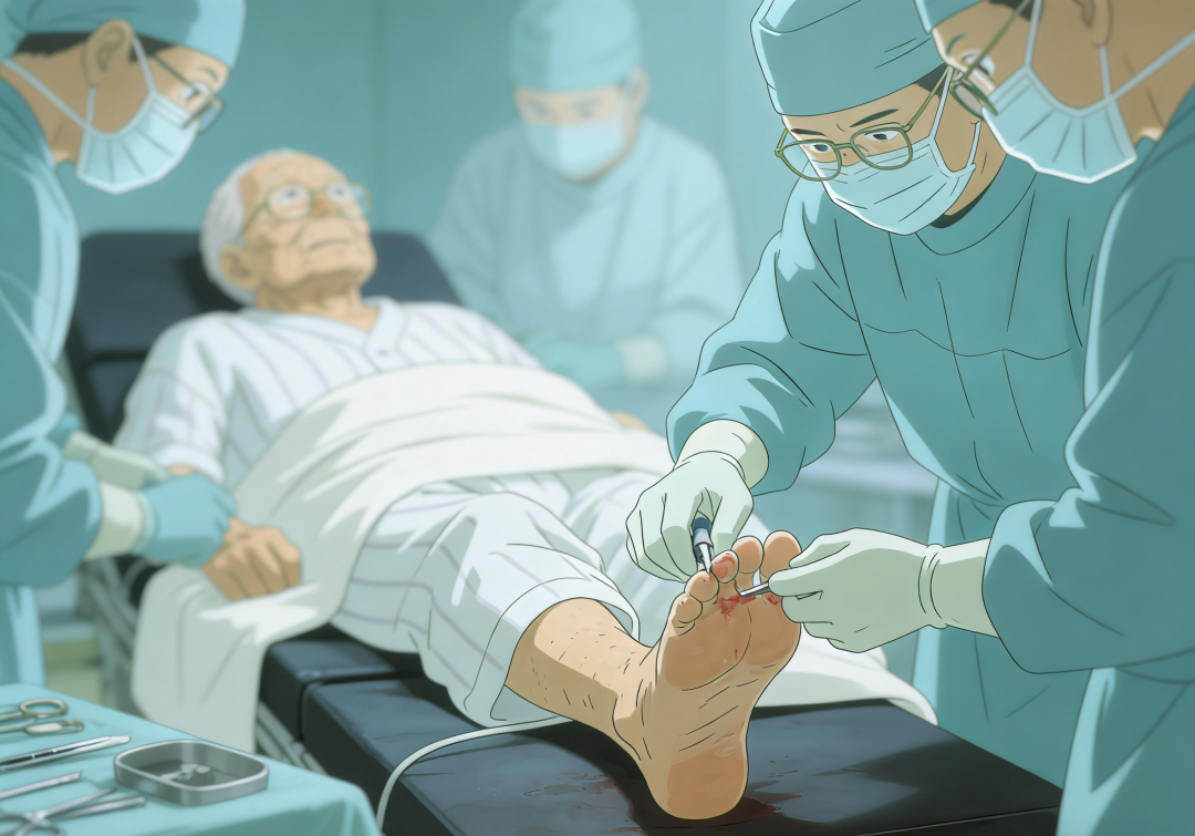 當日,王爺爺被推進手術室。醫生在他腳上切開10厘米的口子,清除了壞死的組織和骨頭。