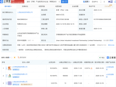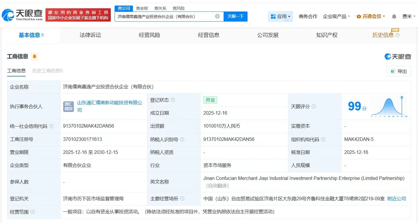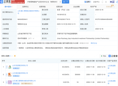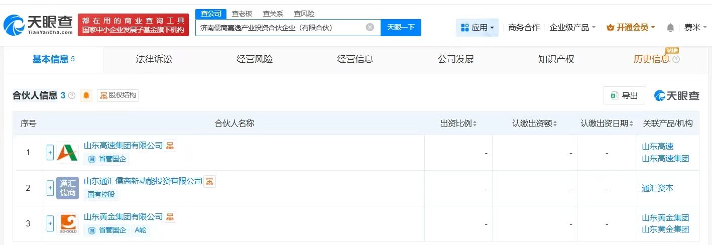 天眼查App顯示,近日,濟南儒商嘉逸產業投資合伙企業(有限合伙)成立,執行事務合伙人為山東通匯儒商新動能投資有限公司,出資額約101億人民幣,經營范圍為以自有資金從事投資活動,由山東黃金集團有限公司、山東高速集團有限公司及旗下山東通匯儒商新動能投資有限公司共同出資。