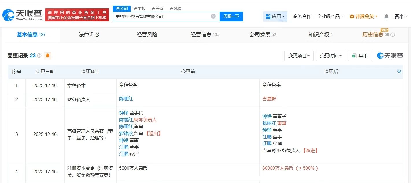 天眼查App顯示,近日,美的創(chuàng)業(yè)投資管理有限公司發(fā)生工商變更,注冊(cè)資本由5000萬(wàn)人民幣增至3億人民幣,增幅500%,同時(shí),部分高管發(fā)生變更。