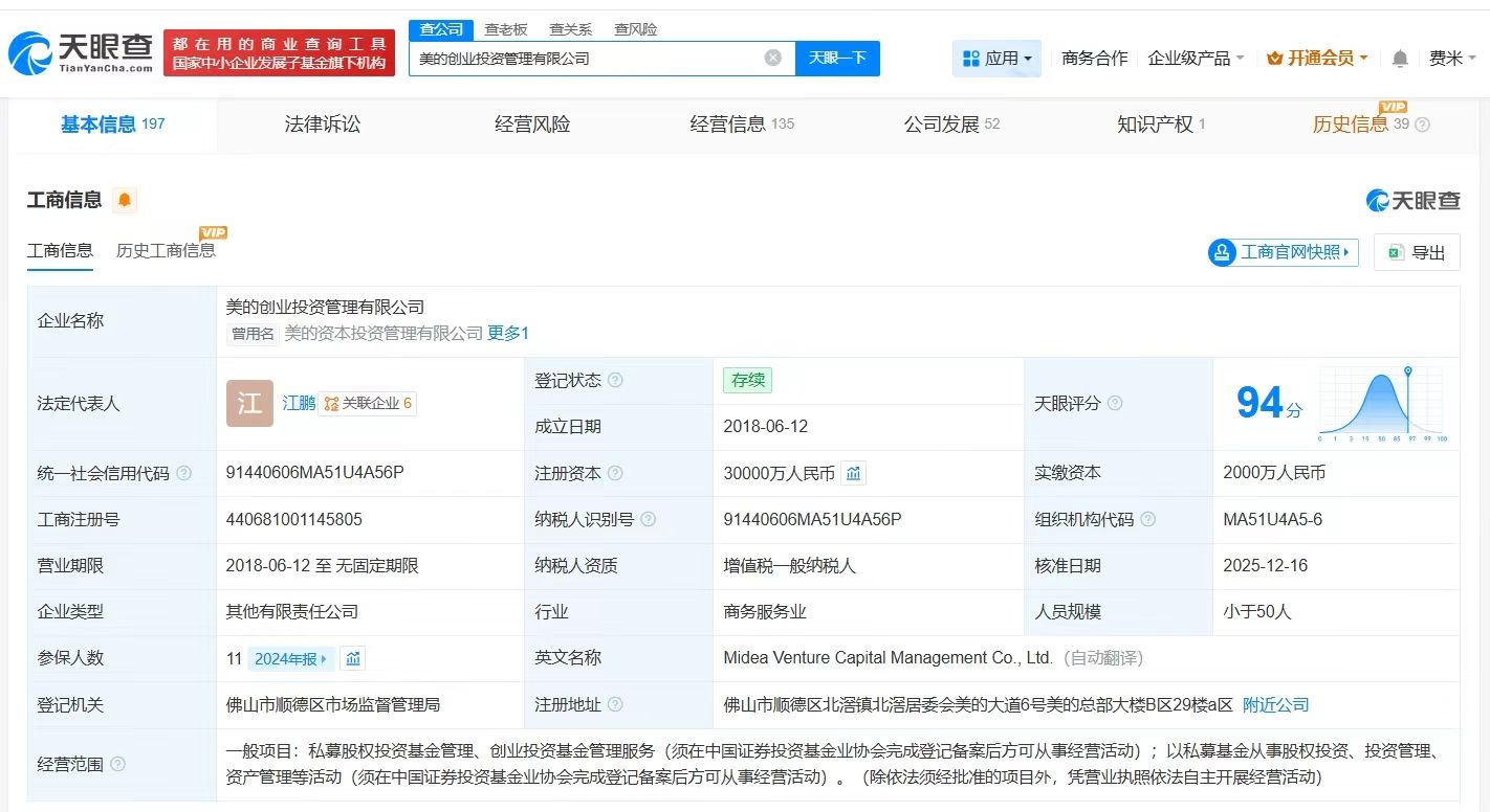 該公司成立于2018年6月,法定代表人為江鵬,經(jīng)營(yíng)范圍為私募股權(quán)投資基金管理、創(chuàng)業(yè)投資基金管理服務(wù),以私募基金從事股權(quán)投資、投資管理、資產(chǎn)管理等活動(dòng),由美的集團(tuán)(000333)及旗下佛山市美的空調(diào)工業(yè)投資有限公司共同持股。