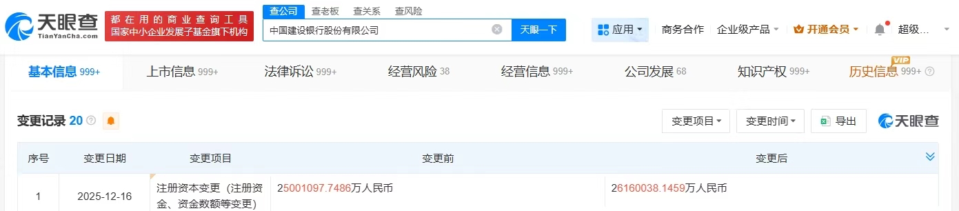 天眼查App顯示,近日,建設(shè)銀行(601939)發(fā)生工商變更,注冊資本由約2500億人民幣增至約2616億人民幣。