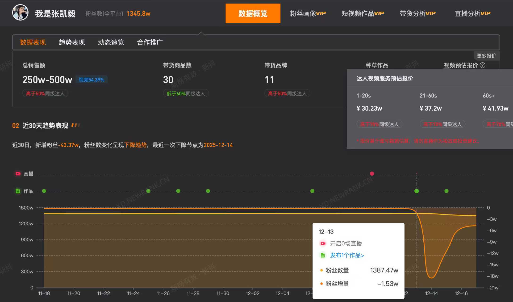 第三方數據顯示,“我是張凱毅”視頻平臺12月13日粉絲數為1387.47萬,截至18日上午11點,其粉絲數為1344.3萬,掉粉超43萬。商業化水平顯示,其1-20s、21-60s、60s以上視頻廣告報價分別為30.23萬、37.2萬和41.93萬。