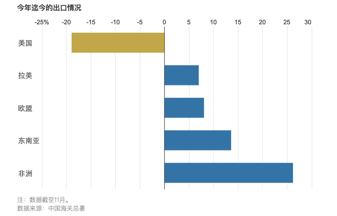 今年前11個月,中國對美國出口額達2.76萬億元,較去年同期減少18.3%。但是,中國對東盟、歐盟出口額分別攀升至4.29萬億元、3.63萬億元,較去年同期分別增長14.6%、8.9%。