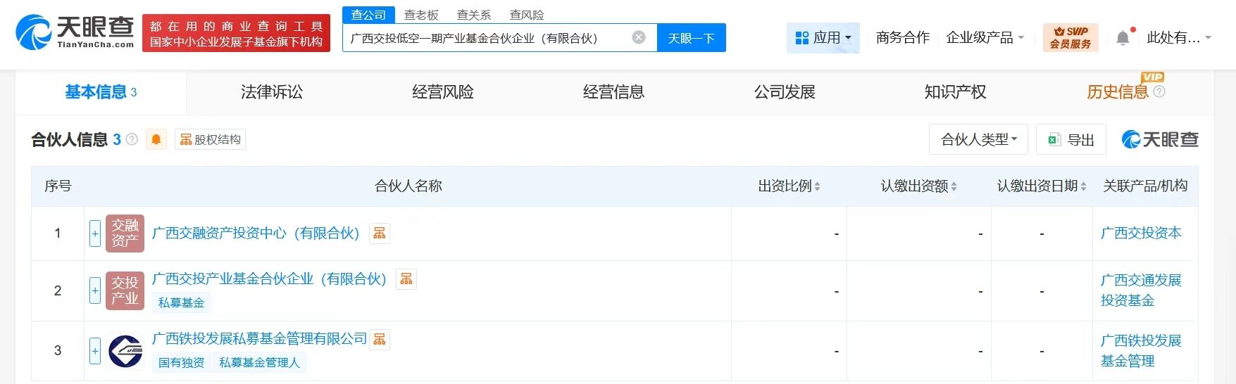 天眼查App顯示,近日,廣西交投低空一期產業基金合伙企業(有限合伙)成立,執行事務合伙人為廣西鐵投發展私募基金管理有限公司,出資額2.01億人民幣,經營范圍為以私募基金從事股權投資、投資管理、資產管理等活動。合伙人信息顯示,該基金由廣西交投產業基金合伙企業(有限合伙)、廣西鐵投發展私募基金管理有限公司、廣西交融資產投資中心(有限合伙)共同出資。