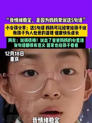 12月18日,重慶,“我情緒穩定,是因為媽媽常說這5句話”,小女孩分享:這5句話 媽媽可以經常給孩子說,教孩子為人處世的道理,健康快樂成長,網友:說得很棒!說出了爸爸媽媽的心里話,每句話都很有意義,回家也給孩子看看。(來源:@悠悠在成長 )